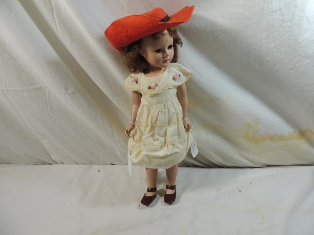 VINTAGE HARD PLASTIC DOLL MOHAIR WIG ORIGINAL SHES AND DRESS. TODDLER DOLL AS SHOWN SEE PHOTO FOR MORE DETAILS.