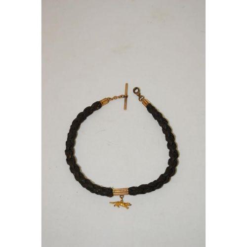 16" VICTORIAN HAIR JEWELRY WATCH FOB W/ GOLD PLATED MOUNTS INCLUDING A 3/4" DOG CHARM ON A TWISTED HAIR ROPING - WEAR & LOSSES TO PLATING & HAIR, IMPERFECTIONS