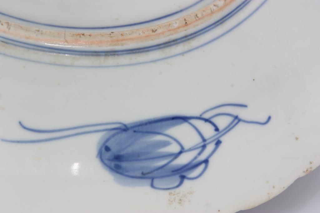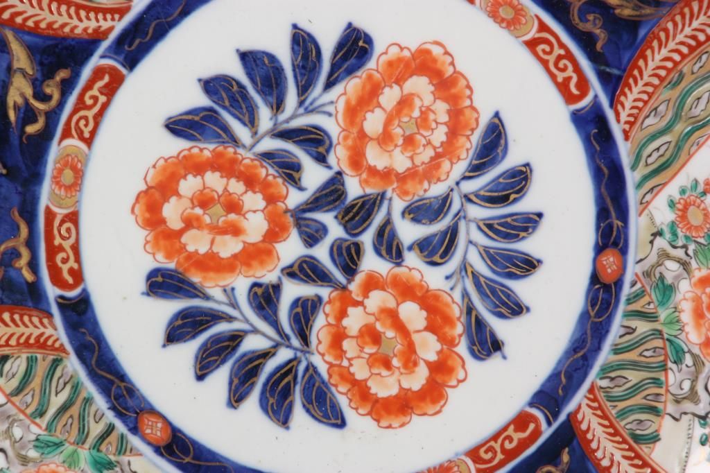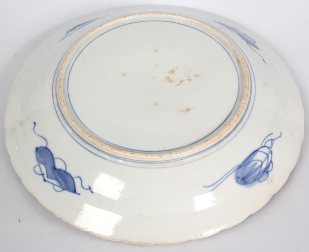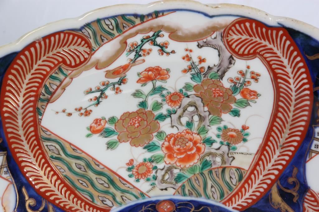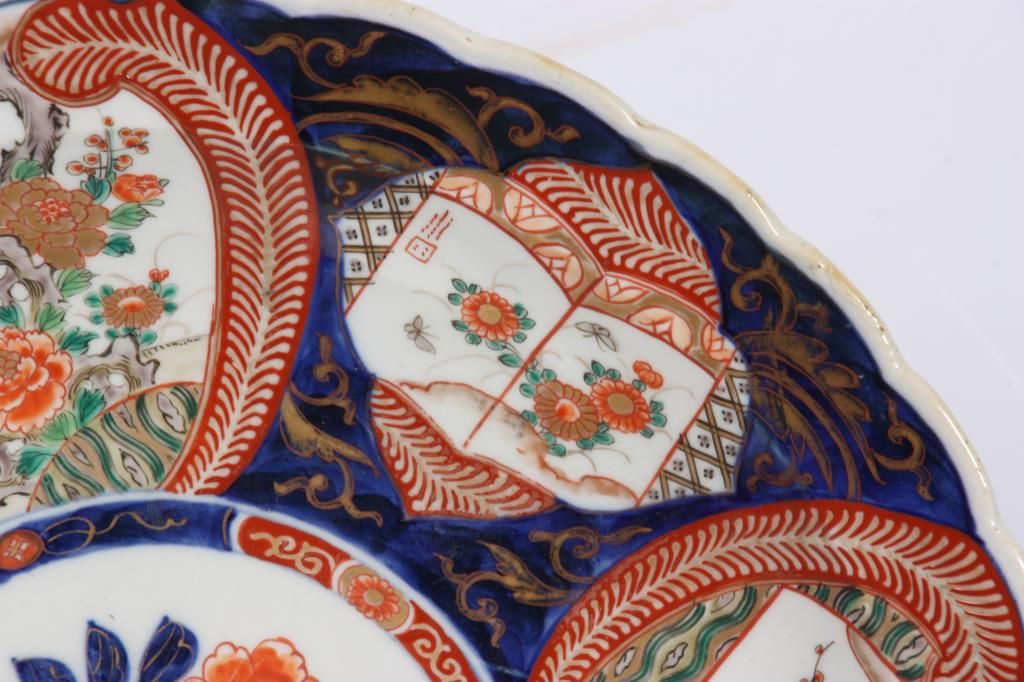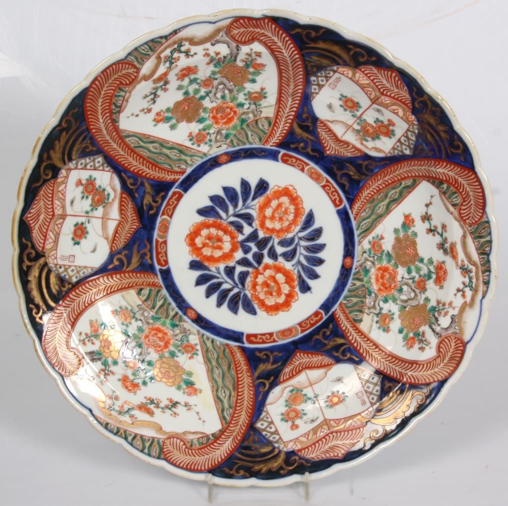 16 in. Imari Charger. 6 panel charger with red enamel and gilt decoration on a blue and white background has various floral scenes within the panels. Republic period piece in excellent condition with nice blue leaf designs on the underside of the rim.