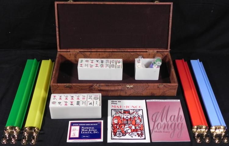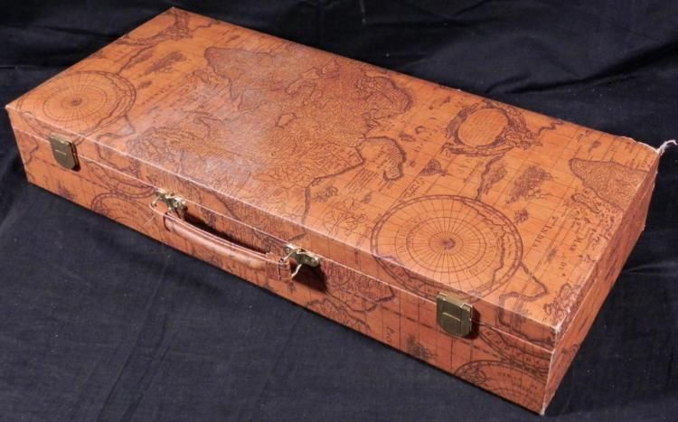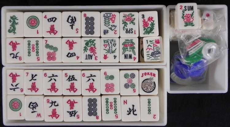 This Mah Jongg set comes in a World Traveller style case, adorned with old maps in an antique brown color. The case has a handle and latches. Inside are removable plastic boxes to hold the tiles. There are 160 tiles, plus 7 extra jokers, a spinner, 2 dice, and chips. Each tile is approximately 7/8" x 1 1/8". The dimensions of the box are 20 1/2 x 9 x 3 1/2 inches. This set is in excellent condition. Also included are three booklets for your game, including How to Play Mah-Jongg, Mah Jongg Made Easy, and the Standard * This is a great mahjong set to take with on your travels.
