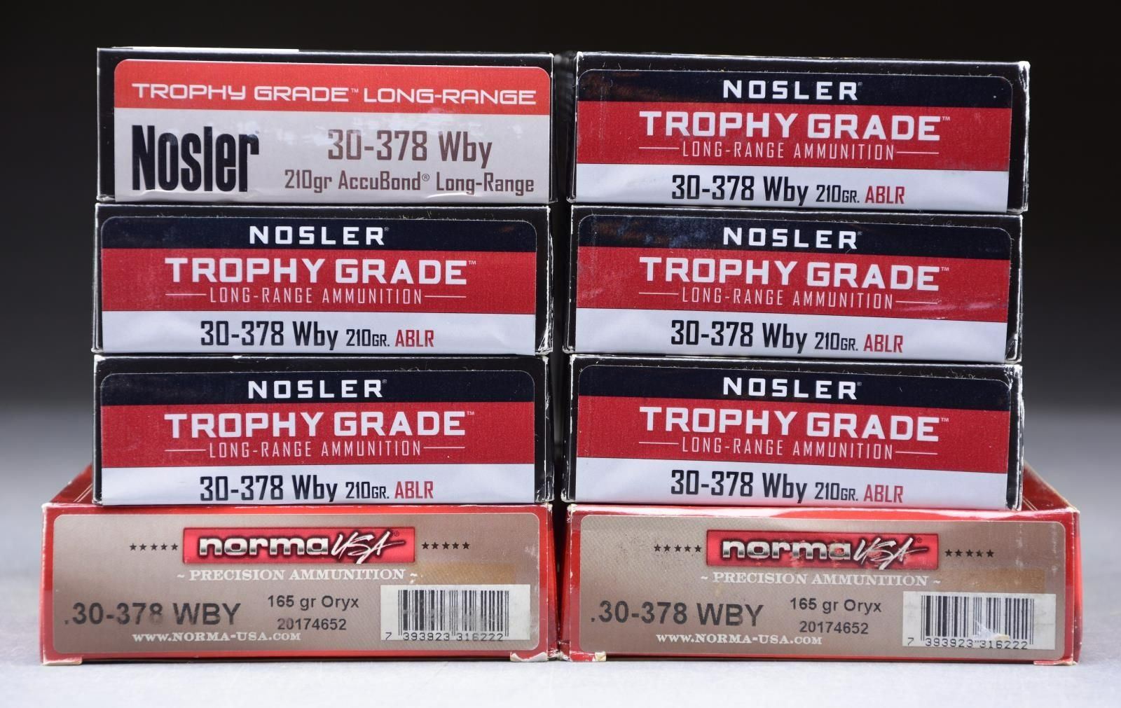 120 RDS. (6 BOXES) NOSLER TROPHY GRADE LONG RANGE 210 GR. ACCUBOND. 40 RDS. (2 BOXES) NORMA 165 GR. ORYX. CONDITION: boxes very good to near excellent; ammo appears serviceable. PROVENANCE: The Collection of Gun Sport Ltd owned by Jon R. Thomas. (02-20330/MD). $400-700.