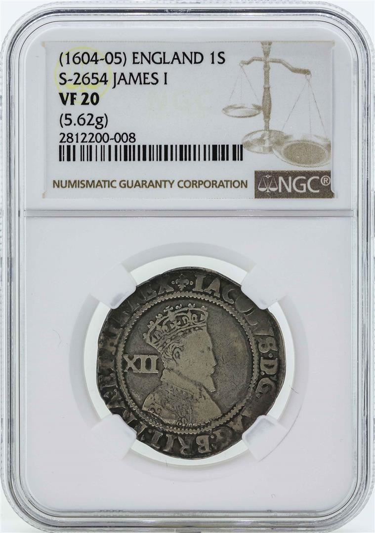 One 1604 England 1 Shilling James I Coin NGC VF20. NGC Certified.