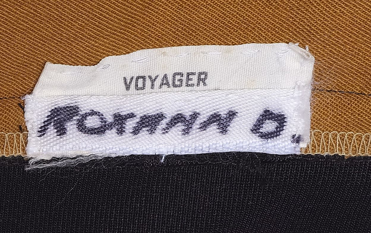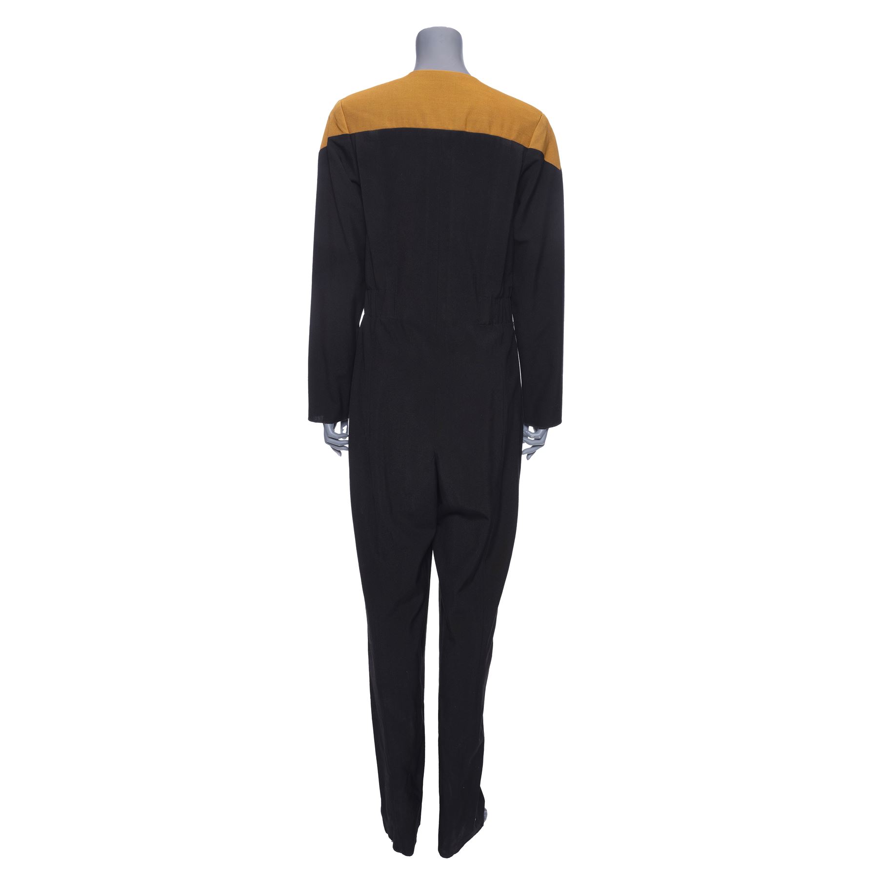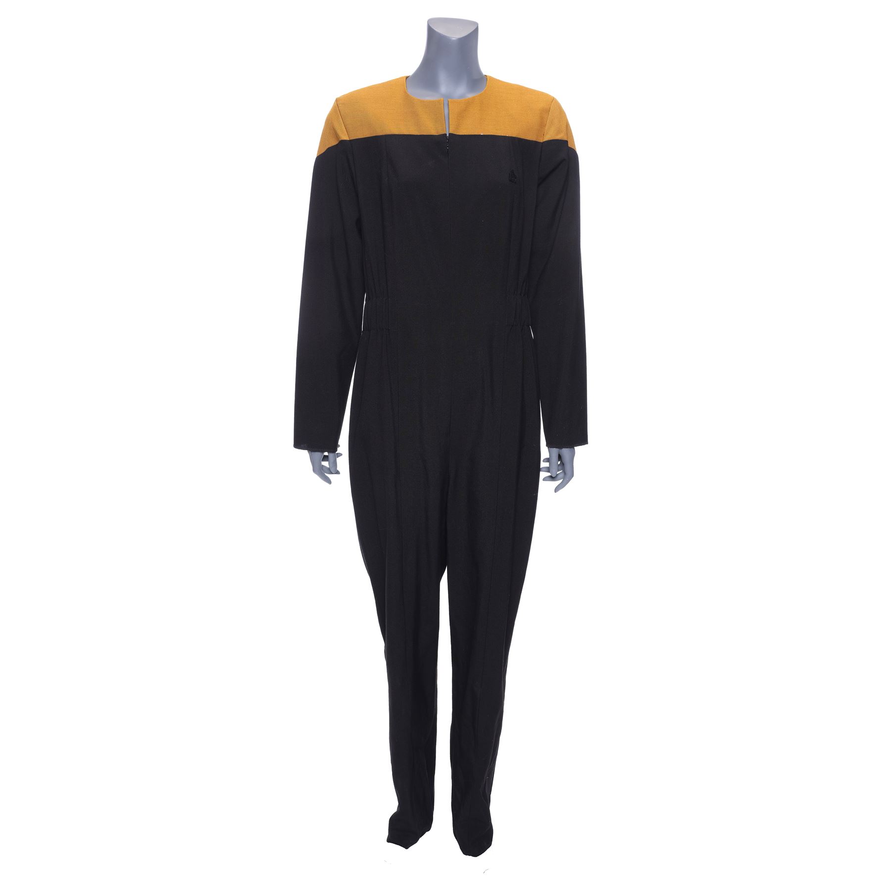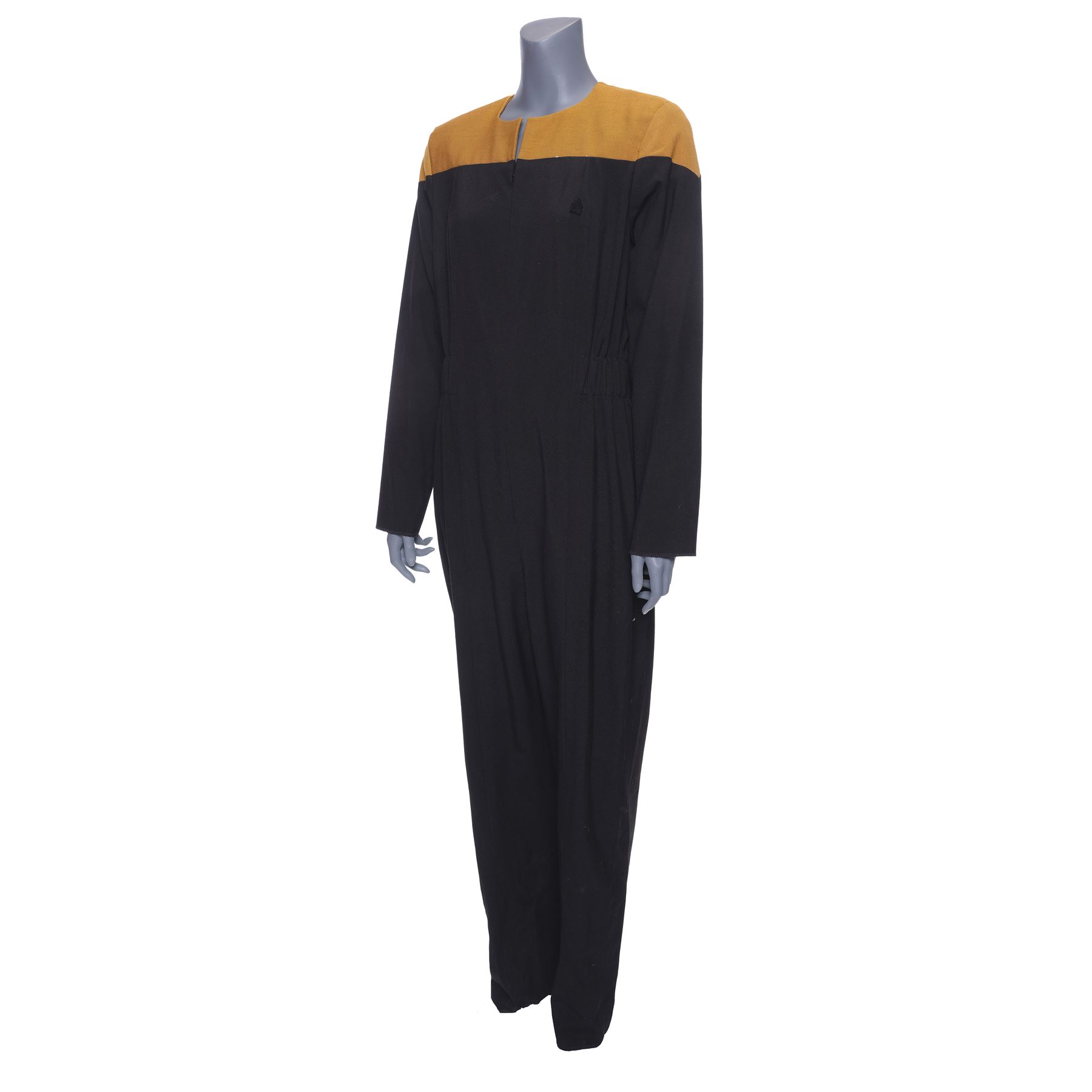 This costume consists of a black and gold-color cotton-blend jumpsuit that includes a triangle patch of hook-and-loop fastener for a combadge, and a waistband with compartments to hold phasers and other devices. This jumpsuit also features a hand-marked tag for "Roxann D." It exhibits mild discoloration on the leg and lifting of the self-fastening strip.