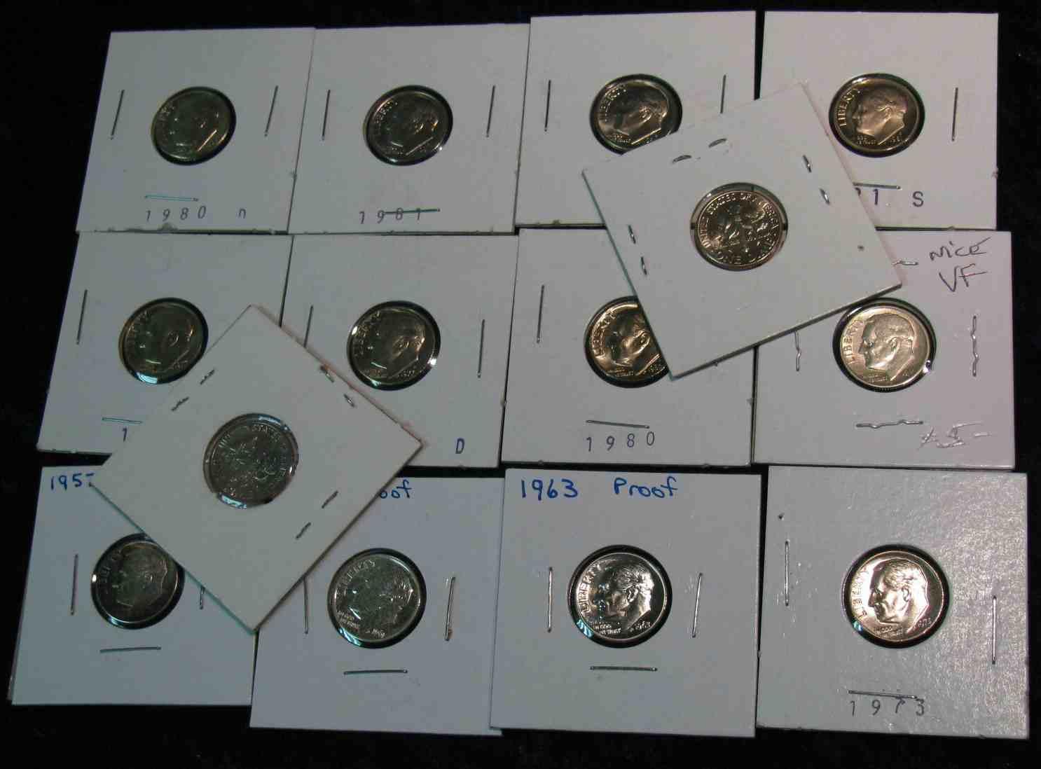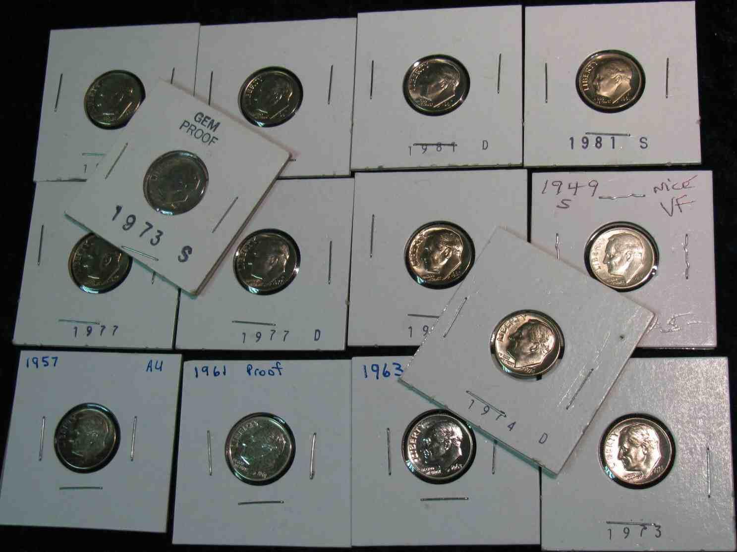 161. 1949S, 57P, 61P Proof, 63P Proof, 73P, S, 74D, 77P, D, 80P, D, 81P, D, & S Roosevelt Dimes. Most BU or Proof.