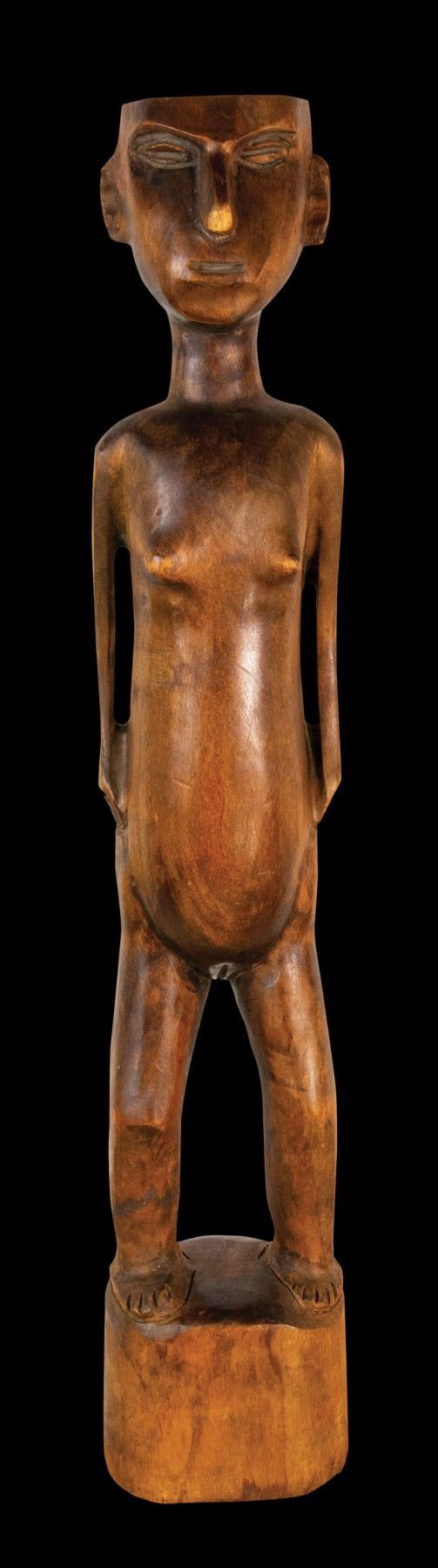 (1960s) Here is a figure based on Bob and LeRoy's encounters on The Big Trip. These figures were patterned after native artifacts gathered during their travels and in an effort to bring more authenticity into the Poly-Pop world, they would offer versions of true art of the Pacific in commercial forms. Here, this Trobriand figure was used in stacked configurations, repeating the figure for use as rail posts, stanchions and decorative support poles. 23.5"x4". VG+ with typical wear.
