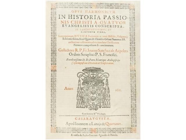 1612. LIBRO: (MUSICA-RELIGION). SANCHEZ AB AZPELETEA, IOANNE: OPUS HARMONICUM IN HISTORIA PASSIONIS CHRISTI A QUATUOR EVANGELISTIS CONSCRIPTA IN LAMENTATIONIBUS, ET CANTORUM TURBA... Caesaraugustae: apud Ioannem a Lanaja & Quartenat, a costa de Pedro Lorente Aguado de Pereda, 1612. Folio. 76 h. de notación gregoriana. Portada enmarcada, a dos tintas, con grabado xilográfico del escudo arzobispal. Enc. de época en pergamino con cierres. Restauraciones al pie de 4 h. que afectan levísimamente el texto. Libro de extremada rareza, desconocido por Salvá y Jiménez Catalán. Palau 297768, que colaciona sólo 64 h. ´En la Exposición de Viena, 1892, consta que figuró una edición de 1672; seguramente, error de imprenta´.