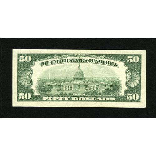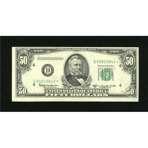 <B>Fr. 2111-D* $50 1950D Federal Reserve Note. Choice About Uncirculated.</B></I><BR>A very light centerfold is found on what would otherwise be a boldly embossed Choice CU star.<BR><BR><b>Shipping:</b> Coins & Currency (<a target="_blank" href="http://www.heritageauctions.com/common/shipping.php">view shipping information</a>)