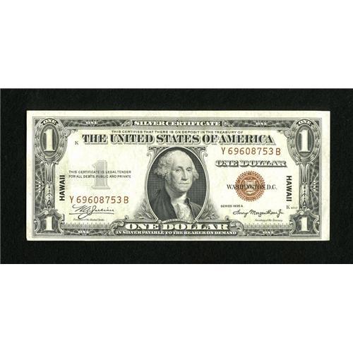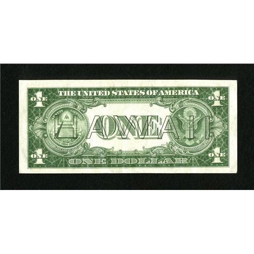 <B>Fr. 2300 $1 1935A Hawaii Silver Certificate. Choice About Uncirculated.</B></I><BR>This is a delightful example of the somewhat scarcer Y-B block that has good margins and embossing but with a light fold to the far left.<BR><BR><b>Shipping:</b> Coins & Currency (<a target="_blank" href="http://www.heritageauctions.com/common/shipping.php">view shipping information</a>)