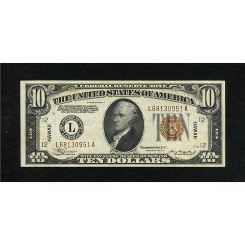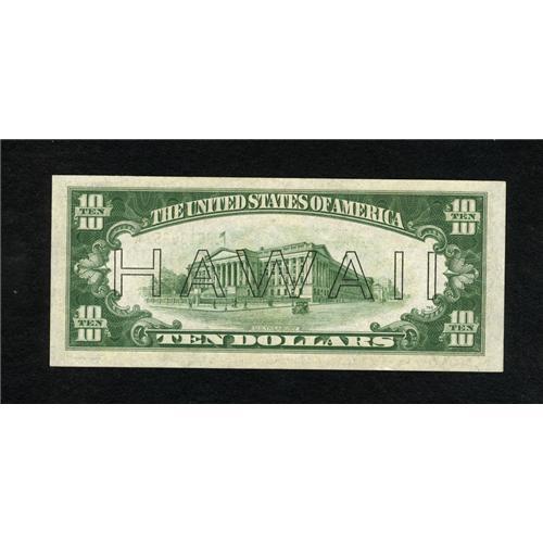 <B>Fr. 2303 $10 1934A Hawaii Federal Reserve Note. About Uncirculated.</B></I><BR>Utter originality is seen on this broadly margined Hawaii Ten which shows a bold impression on the concentric circles of the district seal. The print quality is bold and the evidence of circulation is faint at best. With the Schwartz value of $1500 in CU we would expect roughly half that amount for a very pleasing AU note.<BR><BR><b>Shipping:</b> Coins & Currency (<a target="_blank" href="http://www.heritageauctions.com/common/shipping.php">view shipping information</a>)