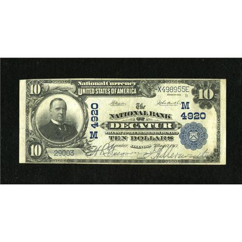 <B>Decatur, IL</B></I> - $10 1902 Plain Back Fr. 630 <B>The NB of Decatur</B></I> Ch. # (M)4920<BR>A deep blue overprint complements the boldly stamped signatures. <B>Fine-Very Fine.</B></I><BR><I>From The Lincoln Collection</B></I><BR><BR><b>Shipping:</b> Coins & Currency (<a target="_blank" href="http://www.heritageauctions.com/common/shipping.php">view shipping information</a>)