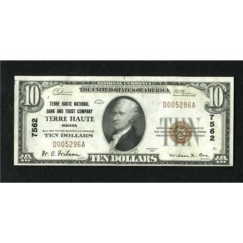 <B>Terre Haute, IN</B></I> - $10 1929 Ty. 1 <B>Terre Haute NB & TC</B></I> Ch. # 7562<BR>Don't miss the opportunity to pick one of these up because once they're gone, they're gone. <B>Choice About Uncirculated.</B></I><BR><BR><b>Shipping:</b> Coins & Currency (<a target="_blank" href="http://www.heritageauctions.com/common/shipping.php">view shipping information</a>)