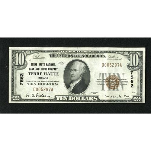 <B>Terre Haute, IN</B></I> - $10 1929 Ty. 1 <B>Terre Haute NB & TC</B></I> Ch. # 7562<BR>Here is another pleasing note. <B>Choice About Uncirculated.</B></I><BR><BR><b>Shipping:</b> Coins & Currency (<a target="_blank" href="http://www.heritageauctions.com/common/shipping.php">view shipping information</a>)