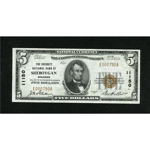<B>Sheboygan, WI</B></I> - $5 1929 Ty. 1 <B>The Security NB</B></I> Ch. # 11150<BR>This is a lightly circulated example which faces up new in the holder. <B>Extremely Fine-About Uncirculated.</B></I><BR><BR><b>Shipping:</b> Coins & Currency (<a target="_blank" href="http://www.heritageauctions.com/common/shipping.php">view shipping information</a>)