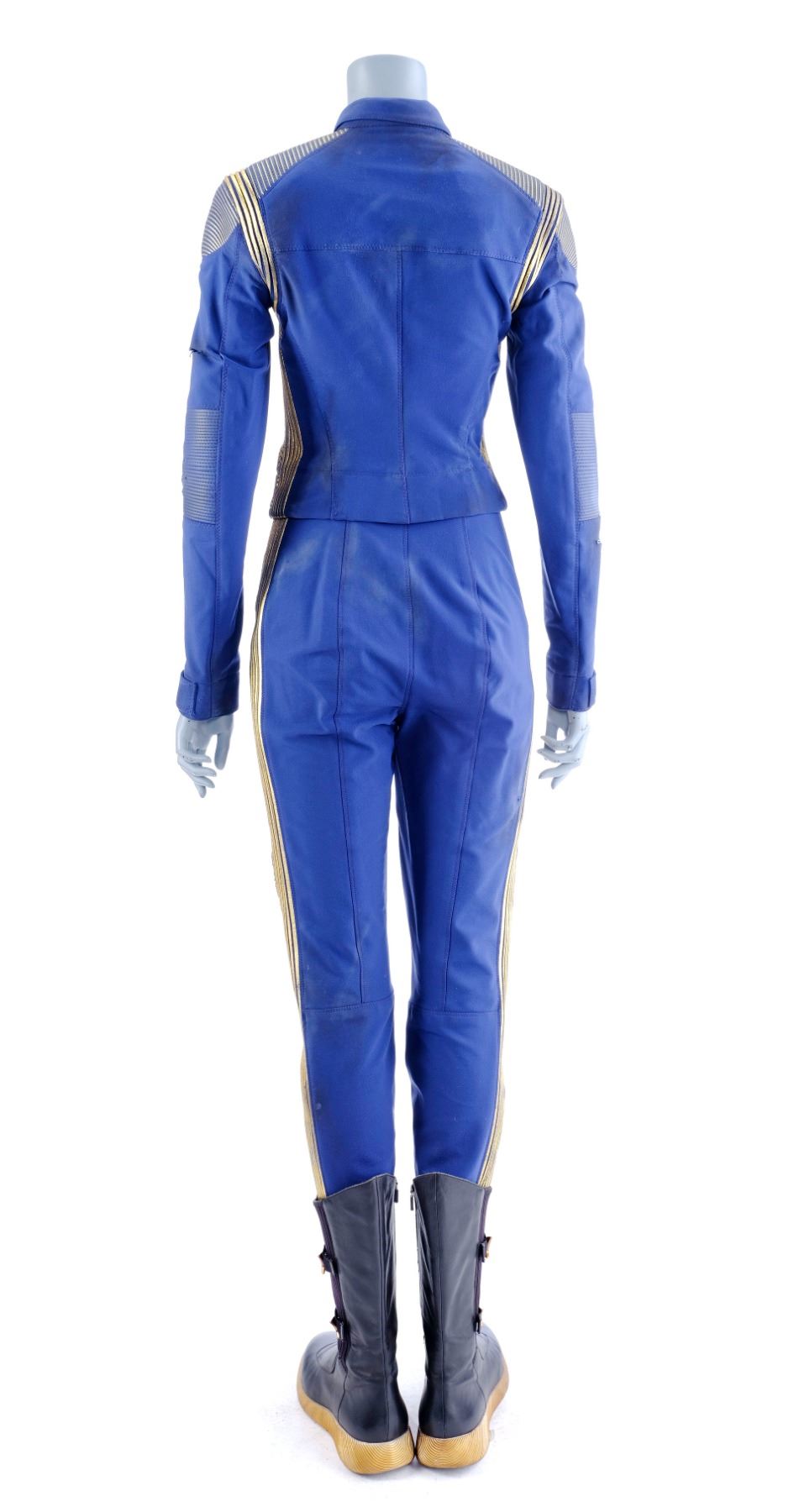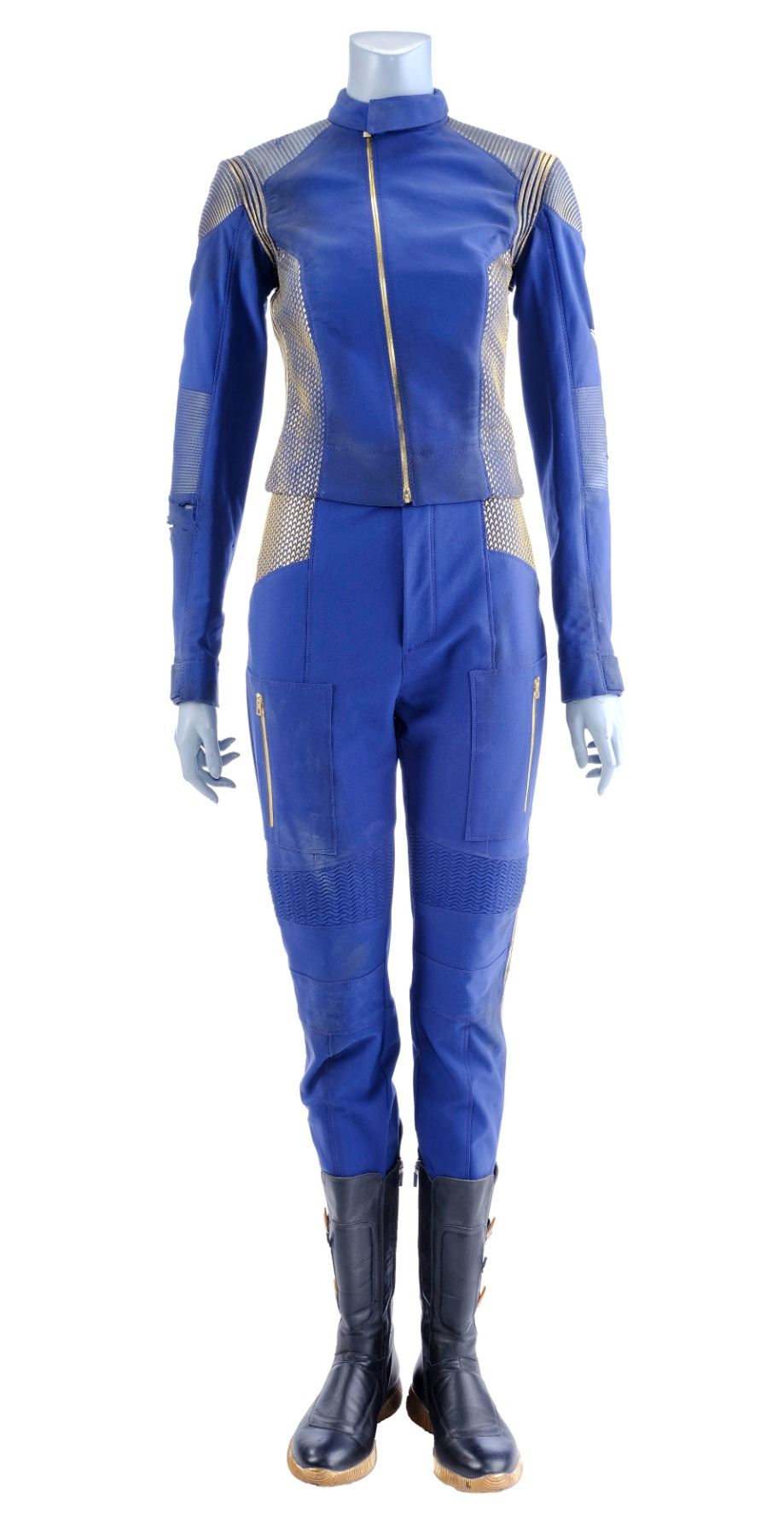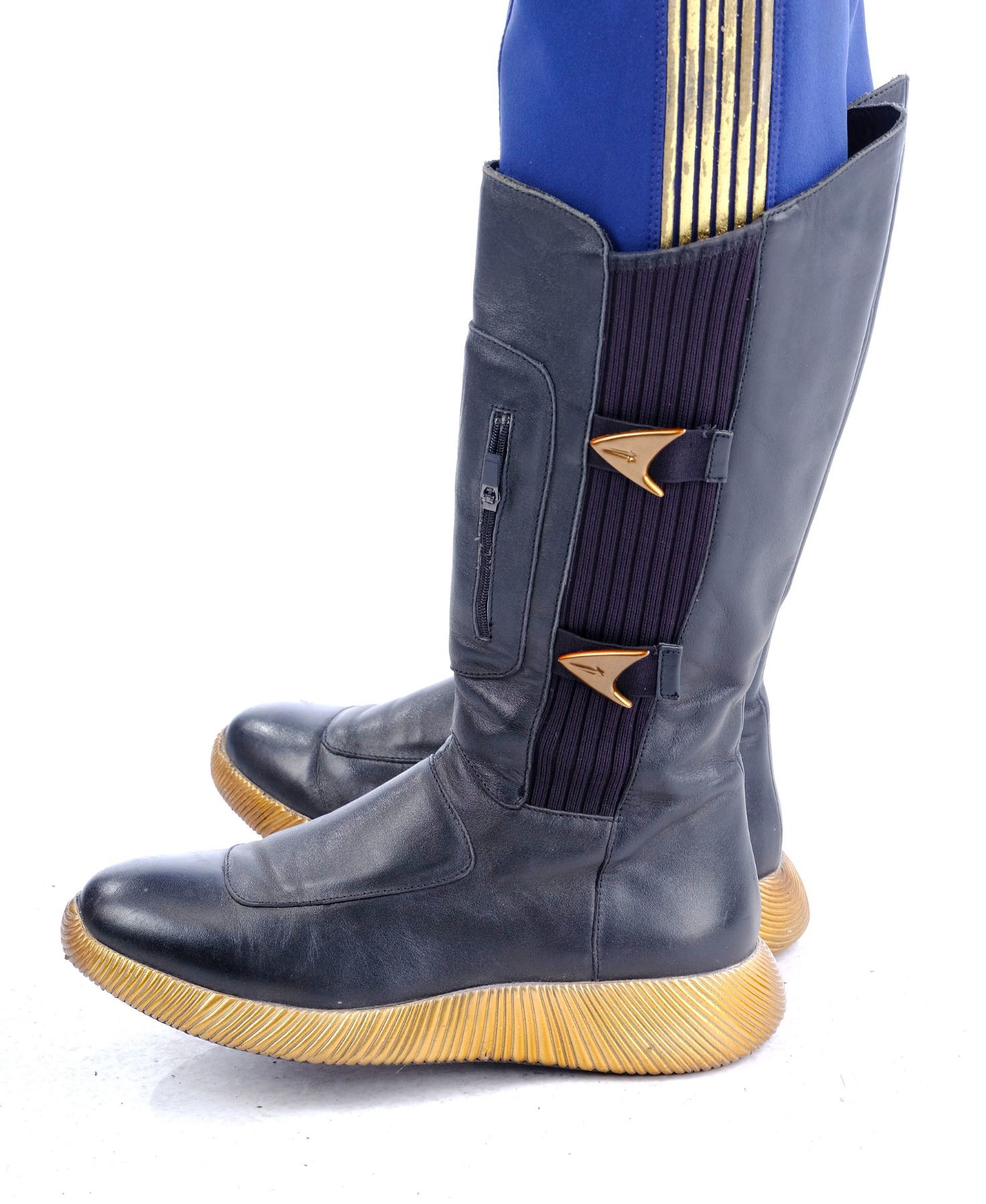 This costume consists of a command division blue cotton-Spandex blend jacket (Size XS) with gold-color embellishments with a hand-marked label "No. 12 PD" and a matching pair of blue and gold-color pants with a hand-marked label "No. 12 PH." A pair of black leatherette Operations boots with copper-color soles and copper-color delta attachments were added to complete the costume. Production intentionally distressed this costume. This lot exhibits frayed fibers and flaked gold-color vinyl.