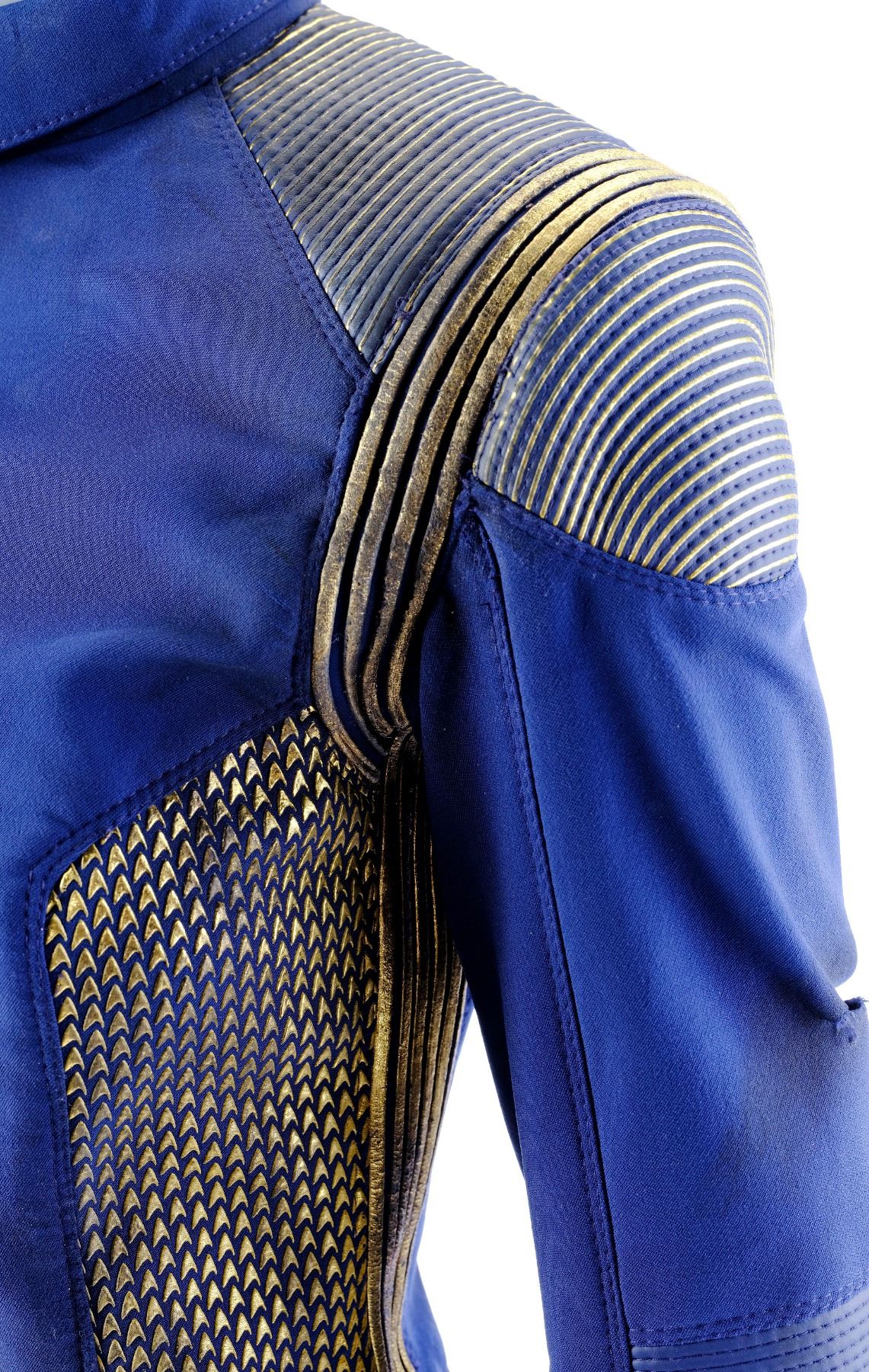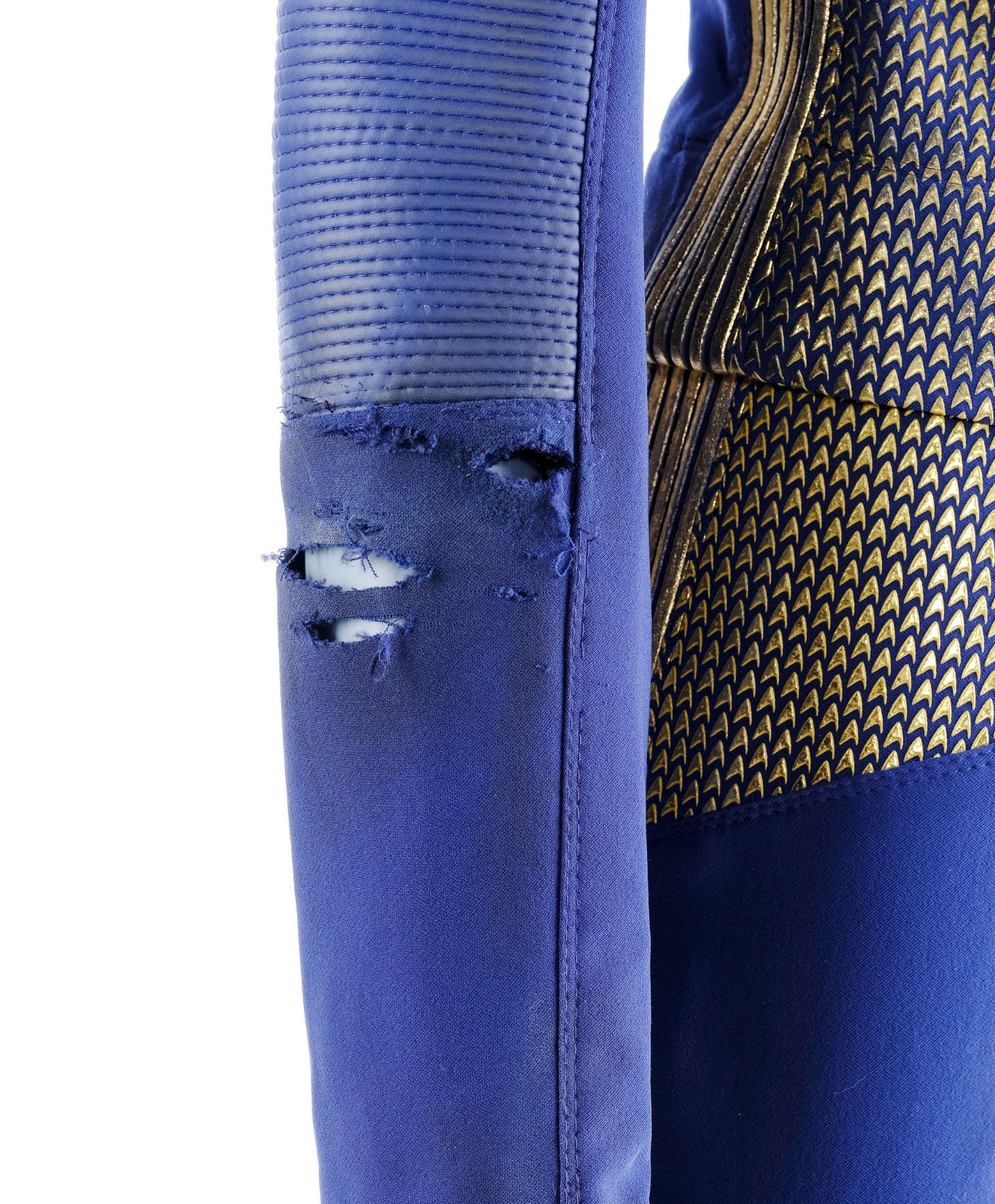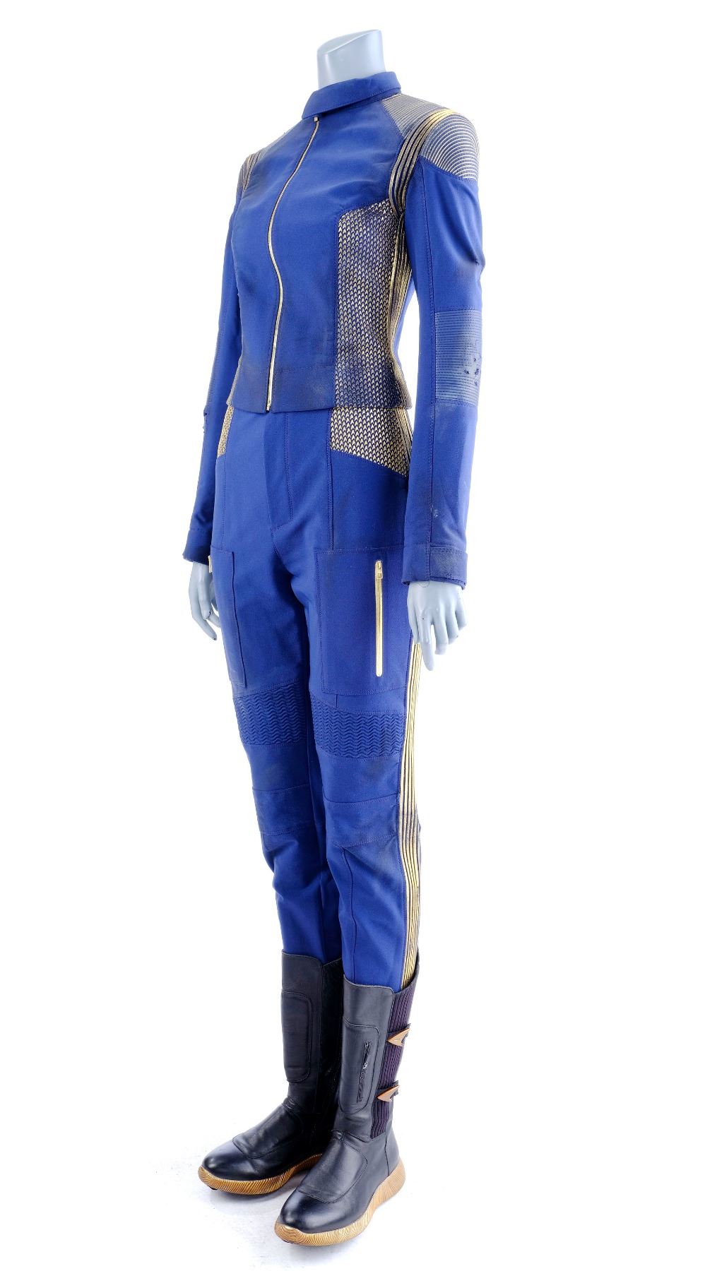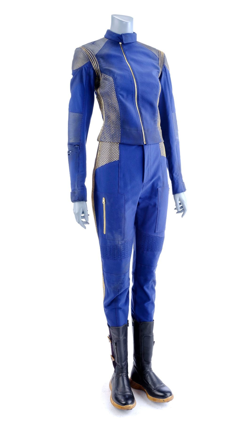 This costume consists of a command division blue cotton-Spandex blend jacket (Size XS) with gold-color embellishments with a hand-marked label "No. 12 PD" and a matching pair of blue and gold-color pants with a hand-marked label "No. 12 PH." A pair of black leatherette Operations boots with copper-color soles and copper-color delta attachments were added to complete the costume. Production intentionally distressed this costume. This lot exhibits frayed fibers and flaked gold-color vinyl.