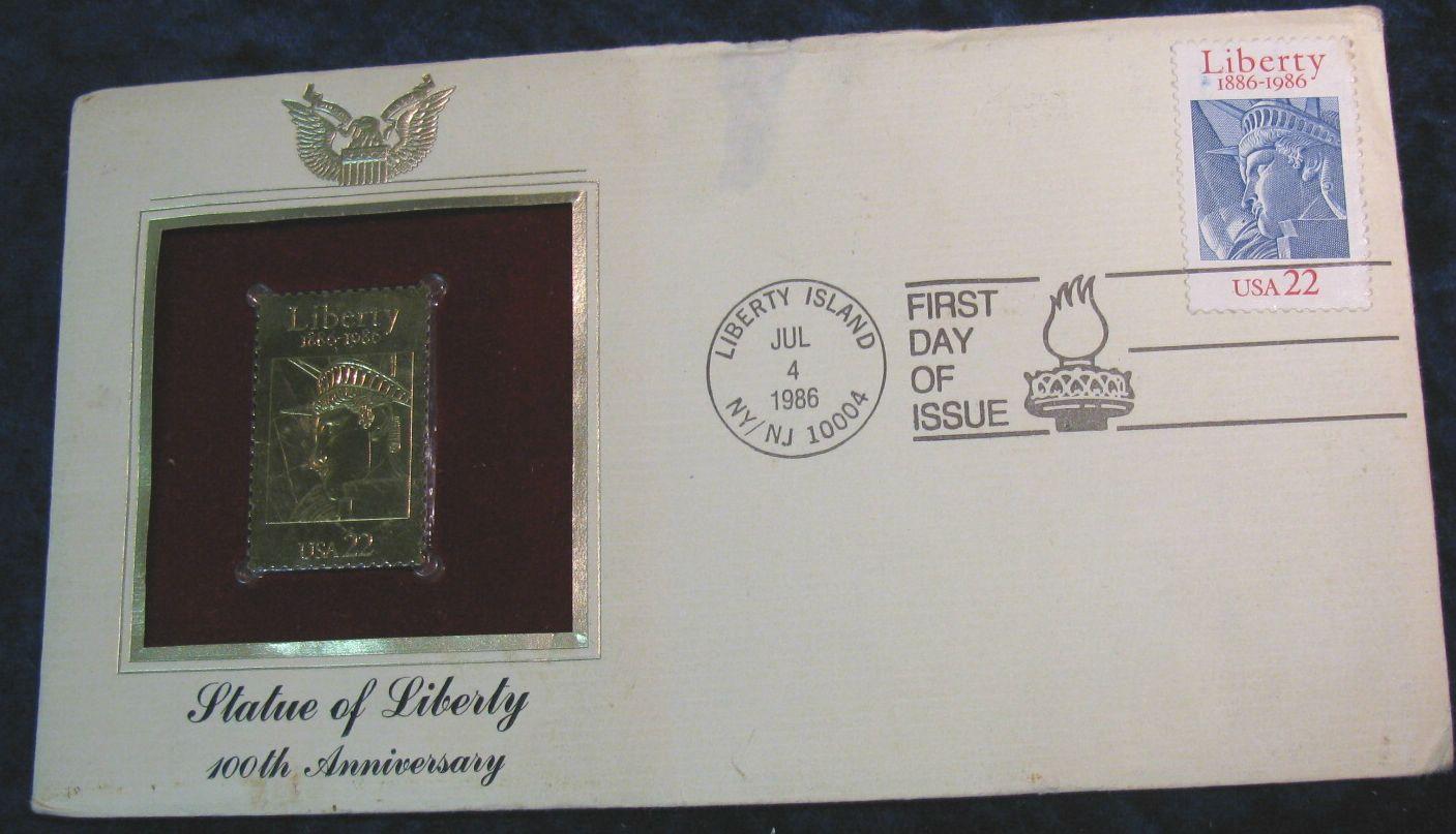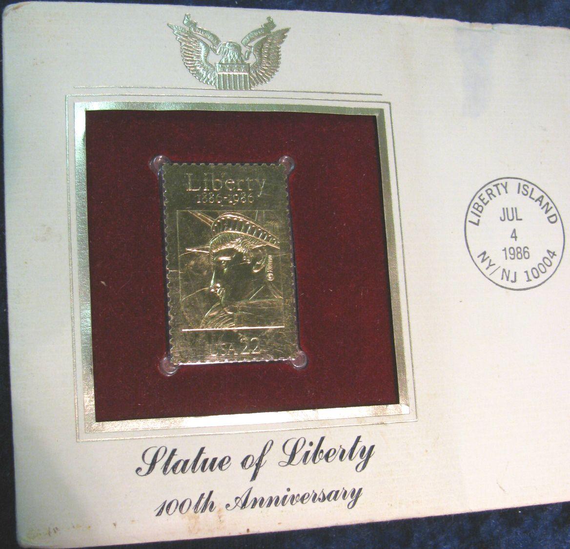 1620. 22Kt Gold Replica Statue of Liberty 100th Anniversary Stamp in cover post-marked Liberty Island, N.Y./N.J. 1986.