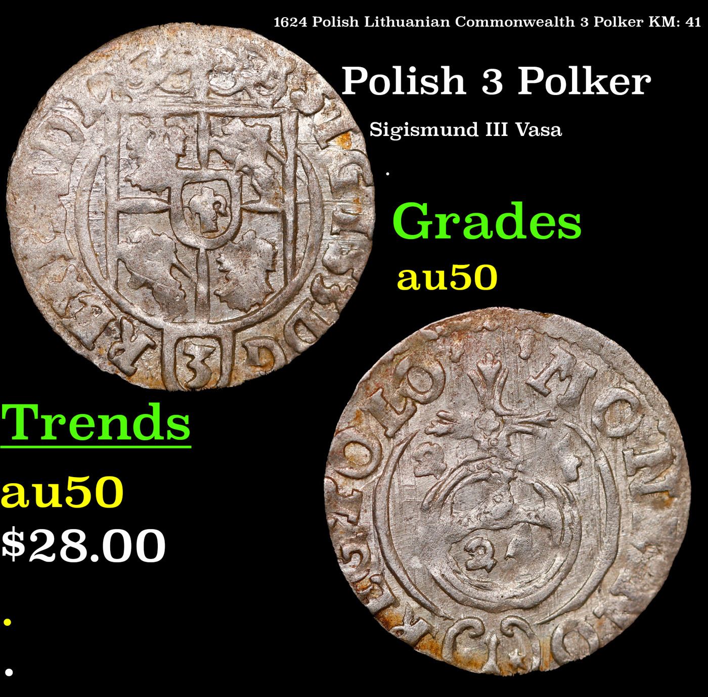 1624 Polish Lithuanian Commonwealth 3 Polker KM: 41 Grades AU, Almost Unc