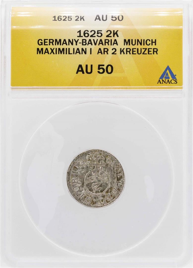 One 1625 Germany-Bava 2 Kreuzer Munich Maximilian I Silver Coin ANACS AU50. ANACS Certified.