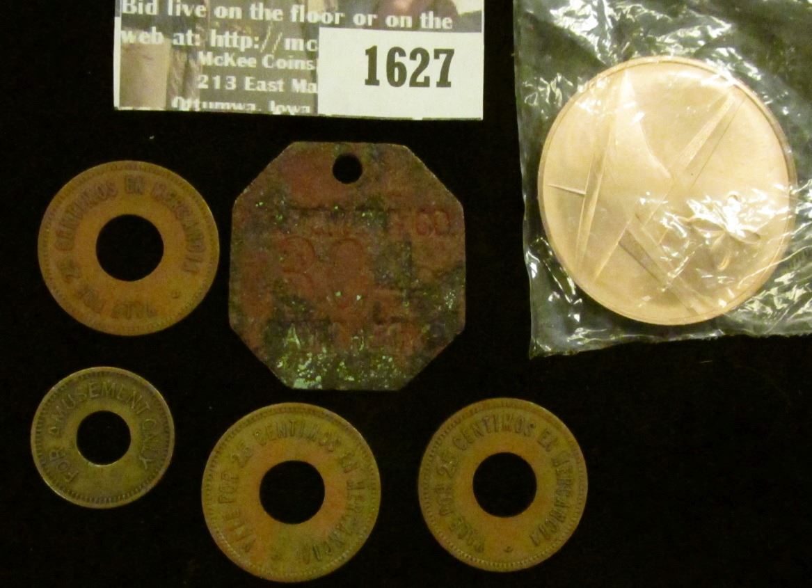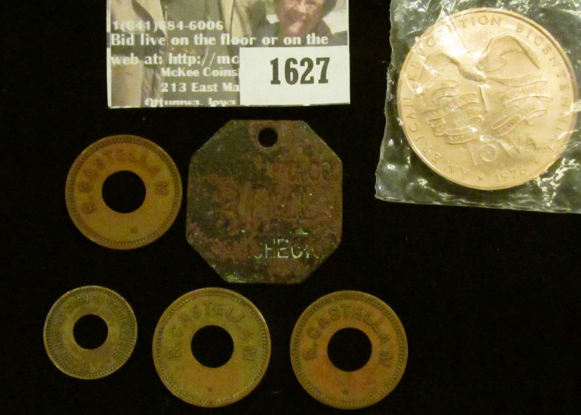 1627 _ 1976 Iowa Centennial Plow Medal BU, W&W MFG. Co. 304 Paycheck & (4) Holed Vending Tokens.
