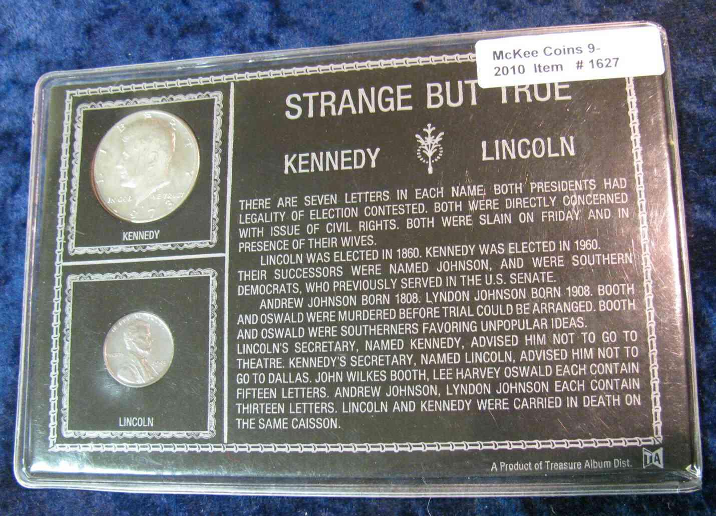 1627. Strange But True Kennedy Lincoln Set in holder. Includes a War Cent.
