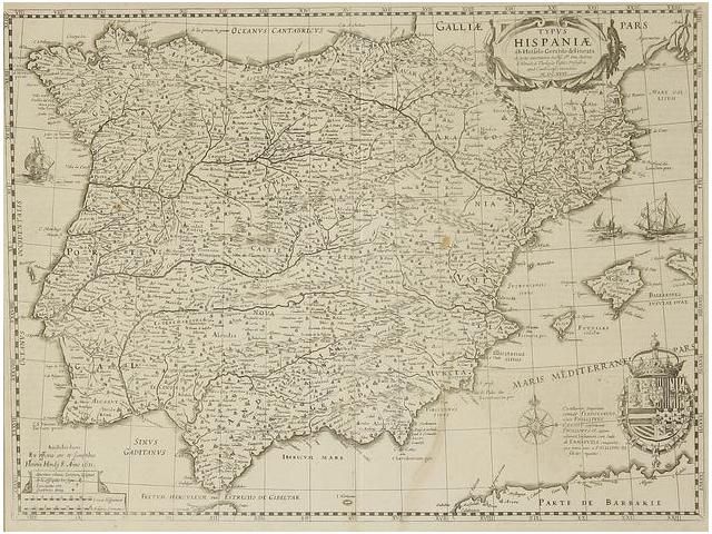 1631. MAPA: (ESPAÑA). HESSEL, GERARDO: TYPUS HISPANIAE... et juxta annotationes Doctibus Domini Don Andreae d´Almada S. Theologiae Publici Profesoris apud Coimbricenses emendatus. Amstelodami: ex. officina Henrici Hondii, 1631. Mapa grabado al cobre, 36 x 49 cm. Escudo grabado del imperio castellano.