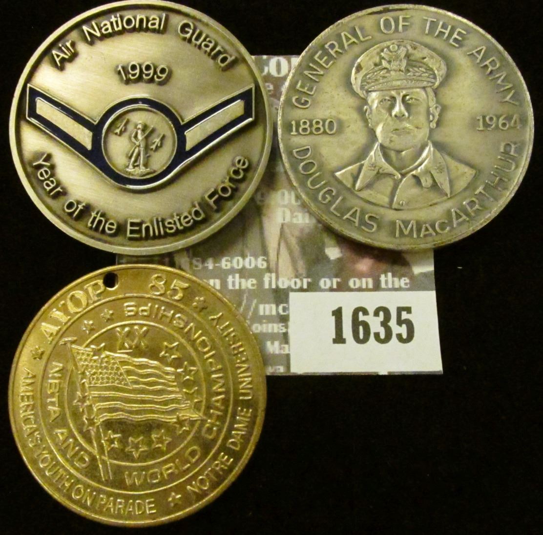 1880-1964 General of the Army, Douglas McArthur, White Medal, 1985 Notre Dame University NBTA World Champions Bronze Holed & 1999 Air National Guard White Medal.