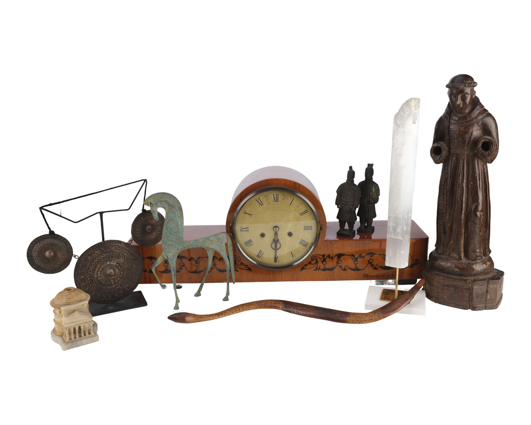 This lot consists of one wood mantel clock; a blue glass horn; a selenite crystal point on a display stand; a beaded necklace on a display stand; metal shield pendants on a display stand; a metal horse with green patina; a wooden puzzle scroll; a polished carved wood monk statue with tonsure; two ceramic samurai warrior statues; a raw carved wood peasant statue; two stone statues; and one carved wood snake. This lot exhibits chipped wood. Dimensions: (approx.) 48.5" x 12.5" x 13.25" (123.25 cm x 31.75 cm x 33.5 cm)