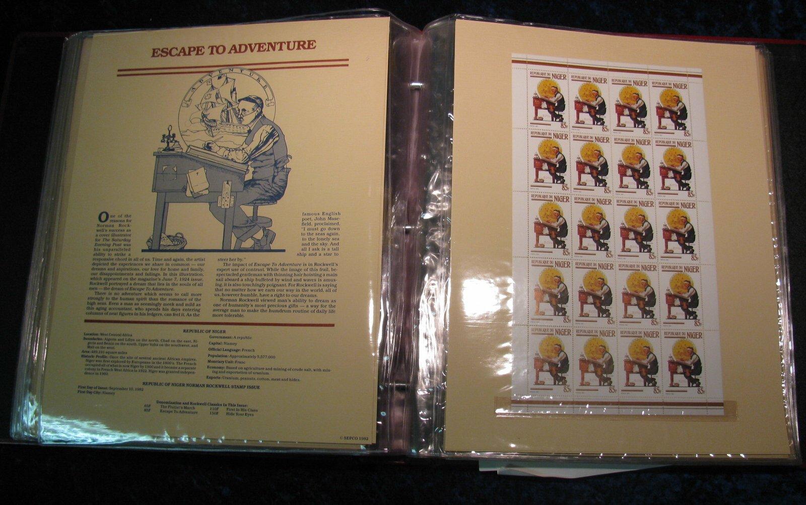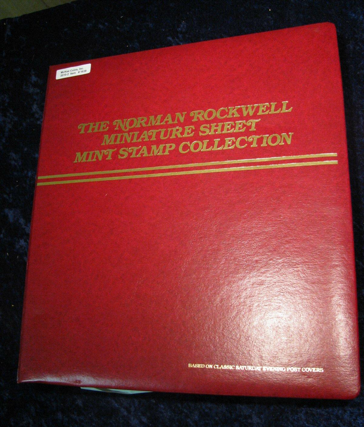 1638. The Norman Rockwell Miniature Sheet Mint Stamp Collection Vol. 2. In a leather bound album with 24K Gold lettering. Each of the sheets contain (20) Original Stamps in Mint Unused Condition. These sheets were sold two at a time for $19.95 for each sheet. There are 26 Sheets plus literature. The total original cost was over $500.00. The denominations of the individual stamps range in value up to 300 Francs.