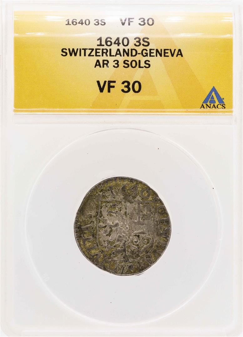 One 1640 Switzerland-Geneva AR 3 Sols Coin ANACS VF30. ANACS Certified.