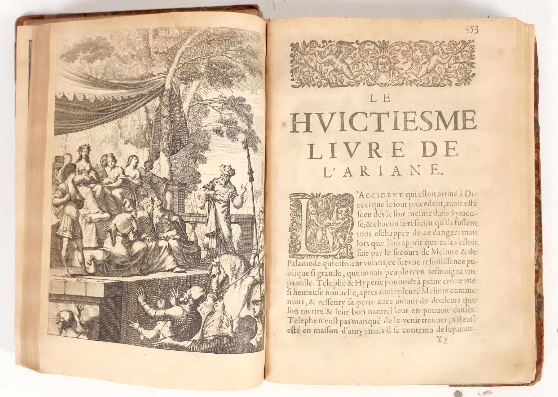 Book title: L'Ariane de Monsieur Des Marest. Fantastic illustration in black & white. "The author Jean Desmarets de Saint-Sorlin was a French poet, dramatist, and novelist, who was born and died in Paris. Early in life he held various offices at court, such as counsellor of the king and secretary of the marine in the Levant." (https://www.biblio.com/book/lariane-monsieur-marest-desmarets-saint-sorlin/d/880162719#). Inscription & marginalia present, though minimal, only about 5 pages. Spine missing, covers detached with worn & peeling corners. Pages in generally good condition with minor foxing, water damage, and few examples of incomplete tear on about 5% of the pages. Missing approximately 20 pages (pages 77-84 & 765-775). Measures about 6.5"x 8.75"x1.75", please inspect.