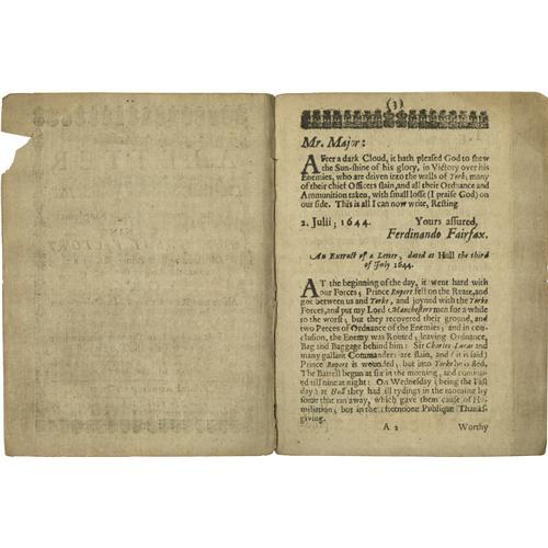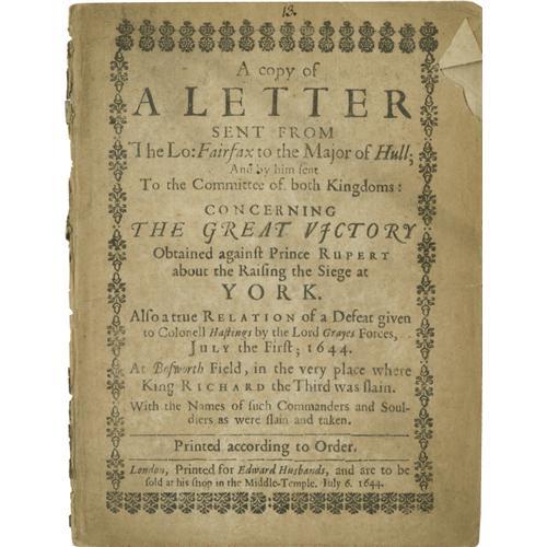 <B>1644 Printed Letter Concerning the Siege at York</B></I> <I>A copy of A Letter Sent From The Lo: Fairfax to the Major of Hull; and by him sent to the Committee of both Kingdoms: Concerning the Great Victory obtained against Prince Rupert about the Raising the Siege at York. Also a true Relation of a Defeat given to Colonell Hastings by the Lord Grayes Forces, July the First, 1644 at Bosworth Field, in the very place where King Richard the Third was slain. With the names of such Commanders and Souldiers</B></I> (sic) <I> as were slain and taken.</B></I> Printed for Edward Husbands (London: 1644), eight pages, no wraps, 12mo (5.5" x 7.25"). Fairfax was a parliamentary general who was driven from York after an unsuccessful siege against the Royalists; later after joining the Scots, he was successful in taking the city. This letter details the second battle, and its successful outcome. Also included are several lists of soldiers and supplies that were taken during a battle at Bosworth Field. Bosworth Field was the site of a famous battle during the War of the Roses which was fought in the 15th century. Richard III, the last of the Plantagenet dynasty, fell in this battle and the House of Tudor assumed the throne. A wonderful printing full of historical references and facts waiting to be delved into! <BR><BR> The printed document is in good condition; disbound; missing wraps; tears along vertical edges; dark staining present on edges.