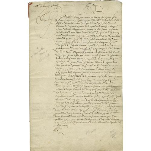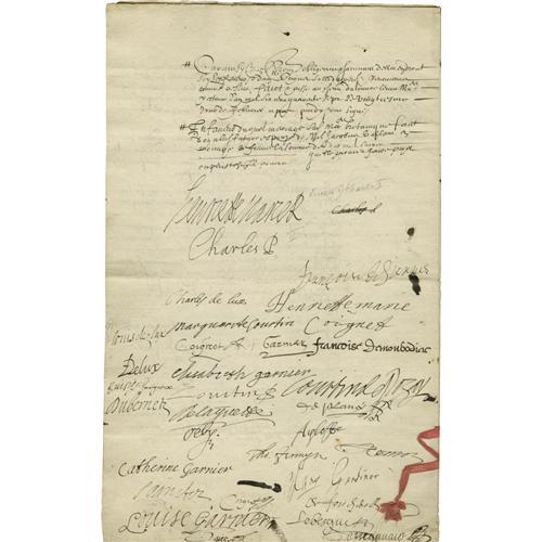 <B>1647 Marriage Contract signed by Queen Henriette Marie, wife of King Charles I of England, and her son, the future King Charles II</B></I> Manuscript DS: <I>"Henriette Marie R", "Charles P", "Charles de lux", "Henriette Marie/Coignet"</B></I> and 25 others, 6p, 8.5" x 13.5". Paris, February 20, 1647. Also signed by members of the families of the bride and groom, Charles de lux and Henriette Marie Coignet, and by members of the court. In May, 1625, 24-year-old Charles, Prince of Wales, married 15-year-old Princess Henriette Marie, daughter of King Henry IV of France and Marie de Medici. Henriette Marie's marriage to Charles required a special dispensation from the Pope because it was the first time that a Catholic princess had married a Protestant prince. They had nine children; their eldest son Charles was born in 1630. Fearing she might be taken hostage in the civil war then ensuing, Queen Henrietta Maria escaped to France in 1644. Granted a small allowance by the French government, she established her household at the Palace of St. Germain near Paris. She kept up an intimate correspondence with her husband the King in England, trying to persuade him to be more flexible in negotiations after his military defeat in 1645. Charles, Prince of Wales, then 15, left England in February, 1646, joining his mother at St Germain in June 1646. Eight months later, he and his mother signed this marriage certificate as guests at the marriage of, coincidently, a bride named Henrietta and a groom named Charles. On January 30, 1649, King Charles I was beheaded. In 1660, Charles, Prince of Wales, was finally invited to return to England when the death of Oliver Cromwell and the collapse of the Protectorate resulted in political turmoil in England. He was declared rightful King of England by the newly-elected Convention Parliament on May 8, 1660. His coronation at Westminster Abbey took place on April 23, 1661, but King Charles II always considered his reign to have begun on January 30, 1649, when his father died. His mother, Queen Henrietta Maria, died in 1669. The document has been tied together with pink ribbon and is in very fine condition.
