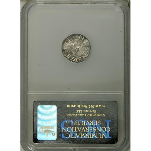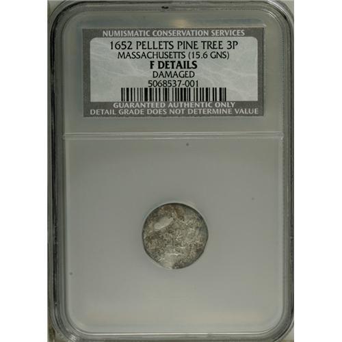 <B>1652 3PENCE Pine Tree Threepence--Damaged--NCS. Fine Details.</B></I> Noe-36, Crosby 2a-B, R.4. 15.6 grains. The reverse design is clear despite moderate charcoal-gray verdigris. Most of the pine tree is present on the obverse, and portions of MASA appear, but the rest of the legends are illegible, possibly because of exposure to heat. Listed on page 37 of the 2007 <I>Guide Book.</B></I><BR><I>Ex: Altman Haffner Sale, 4/75, lot 648, which realized $180.</B></I><BR><BR><b>Shipping:</b> Coin/Currency (<a target="_blank" href="http://www.heritageauctions.com/common/shipping.php">view shipping information</a>)