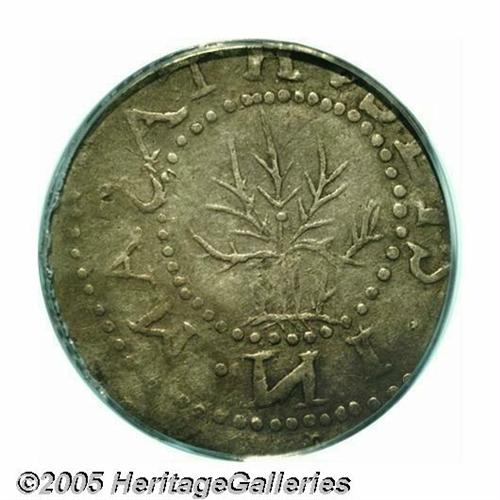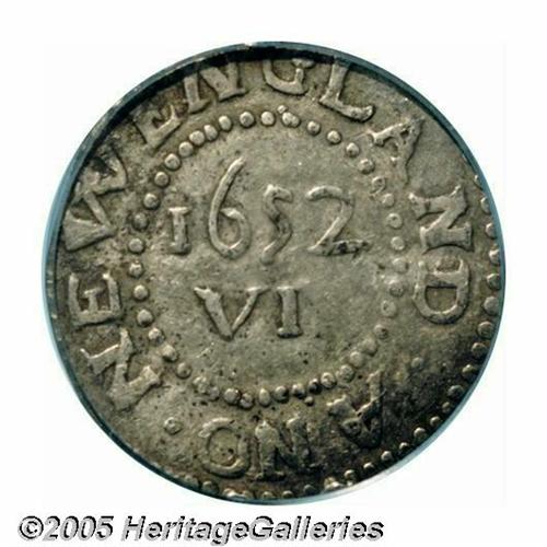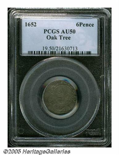 <B>1652<6PENCE> Oak Tree Sixpence AU50 PCGS.</B></I> Noe-21, R.5. This scarce variety is characterized by the first S lacking its top and having been cut into the die backward. The W in NEW on the reverse is wide. Unlike most Noe-21 sixpence, this piece has a centering problem on the obverse. The reverse, however, is well centered. This particular coin shows considerable sheen and is light in color overall, with deeper patina around the devices.