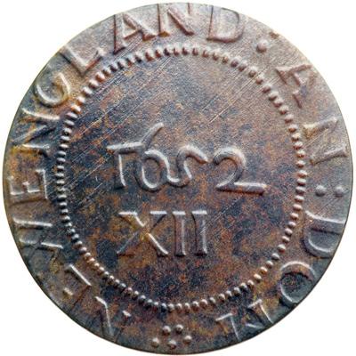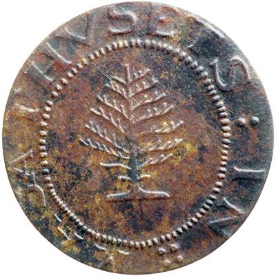 1652 Copley Restrike of the Massachusetts Pine Tree Shilling in copper. MS-60. Glossy chocolate mixed with darker olive brown. The toning is a bit mottled; otherwise this piece is as struck in medal turn (head-to-head). Weight 63.1 grains.