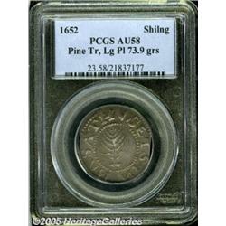 <B>1652<img border='0' src='http://www.heritagecoins.com/images/star.gif' width=10 height=10>HILNG Pine Tree Shilling, Large Planchet AU58 PCGS.</B></I> Noe-9, R.6. 73.9 grains. This is a later die state of Noe-9 as seen by the recutting of the letters at the top of the obverse. This has the effect of the HV being indistinct and blobby, apparently the metal could not be forced up into the die. The lettering is remarkably well centered on each side, and there is a small clip missing from the 3 o'clock and 9 o'clock positions. Slightly wavy, as usually seen, the surfaces are medium gray with slightly lighter accents over the lettering and devices. Very rare in such a superior state of preservation.
