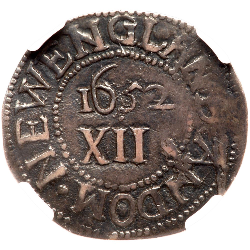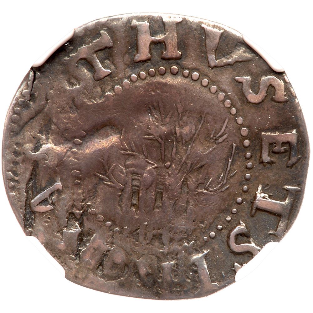 1652 Massachusetts Oak Tree Shilling Noe-6 R7- NGC graded AU50. Glossy steel gray blending to darker steel in protected areas. The surfaces are very nice and the only marks are two planchet voids on the left side of the obverse tree side. The obverse is uneven due to severe die clashmarks that are often found on this variety, but the reverse denomination side does not show any clashmarks. Late die state with obvious die rust and cracks on the reverse. A very nice example of this extremely rare variety and a great opportunity for the advanced collector of this series. The weight is listed as 68.8 grains on the NGC label, and the Noe-6 attribution is also shown there. NGC population for the type, not this rare variety is 3 with 32 finer. Estimated Value 7,500 - UP