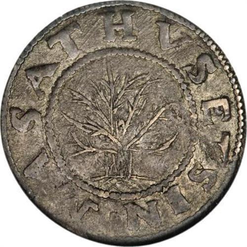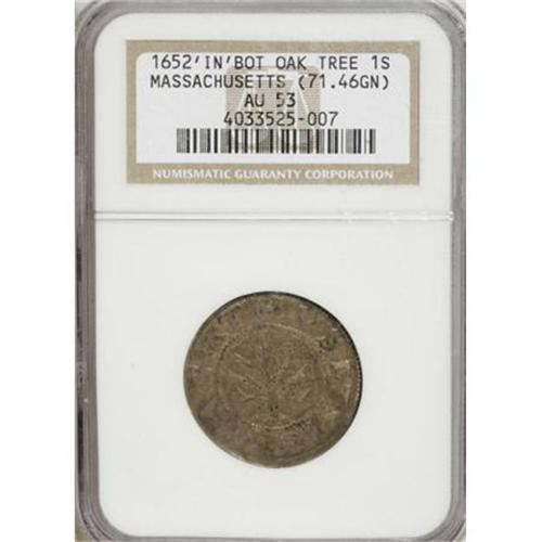 <B>1652 SHILNG Oak Tree Shilling AU53 NGC.</B></I> IN at Bottom. Crosby 4-C, Noe-9, R.5. 71.46 gn. Steel-gray and almond-gold graces this partly lustrous and better-variety Oak Tree shilling. Noe-9 is similar at first glance to Noe-8, but close examination reveals substantial re-engraving of the design by the Boston Mint. Both sides have full legends, and the obverse centering is perfect. The reverse is slightly misaligned toward 12 o'clock, affecting only the outer beaded border. All branches of the tree are clear, and the eye appeal is exceptional for the type. Impressively smooth aside from a depression on the second T in MASATHVSETS. Listed on page 37 of the 2008 <I>Guide Book.</B></I><BR><BR><b>Shipping:</b> Coins & Currency (<a target="_blank" href="http://www.heritageauctions.com/common/shipping.php">view shipping information</a>)