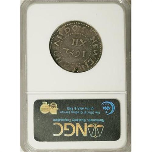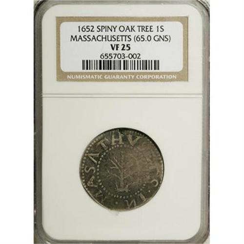 <B>1652 SHILNG Oak Tree Shilling VF25 NGC.</B></I> Crosby 7-B, Noe-14, R.4. 65.0 gn. The "Spiny Tree" variety. A slate-gray and mildly granular example with unclipped legends and a small mint-made flan split at 12 o'clock. Slightly wavy, as produced from a rocker press, which causes uneven wear on the right half of the tree and a few letters of the peripheral reverse legend. Listed on page 37 of the 2008 <I>Guide Book.</B></I><BR><BR><b>Shipping:</b> Coins & Currency (<a target="_blank" href="http://www.heritageauctions.com/common/shipping.php">view shipping information</a>)