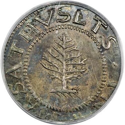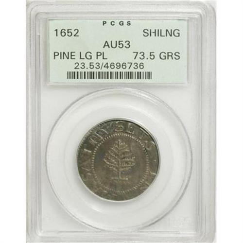 <B>1652 SHILNG Pine Tree Shilling, Large Planchet AU53 PCGS.</B></I> Pellets at trunk. Crosby 12-I, Noe-1, R.2. 73.5 gn. Satin luster dominates most of this attractively toned example. Apple-green and tan shades grace the evenly struck surfaces. The surfaces are gently rippled, as made from a rocker press. The peripheral legends are mostly intact, with a few lower obverse letters partly off the flan. The fields within the beaded circles show a few toned-over marks. Certified in a green label holder. Listed on page 37 of the 2008 <I>Guide Book.</B></I><BR><BR><b>Shipping:</b> Coins & Currency (<a target="_blank" href="http://www.heritageauctions.com/common/shipping.php">view shipping information</a>)