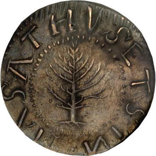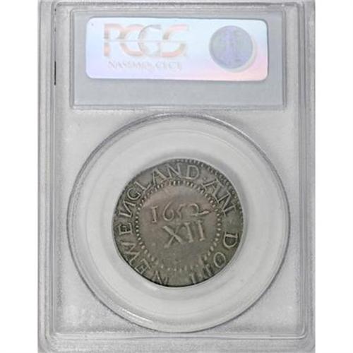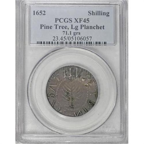 <B>1652 SHILNG Pine Tree Shilling, Large Planchet XF45 PCGS.</B></I> No pellets at trunk. Crosby 5-B2, Noe-5, R.4. 71.1 gn. Noe-4 through 6 are from the same die pair, but close examination reveals small legend differences between the varieties, where Boston Mint workers made subtle repairs to the dies. This gently shimmering lavender-gray and apple-green example has pleasing surfaces, a clear tree, and virtually complete legends. Somewhat wavy, as made from a rocker press. Listed on page 37 of the 2008 <I>Guide Book.</B></I><BR><BR><b>Shipping:</b> Coins & Currency (<a target="_blank" href="http://www.heritageauctions.com/common/shipping.php">view shipping information</a>)