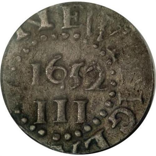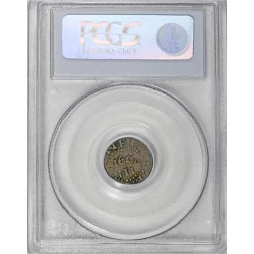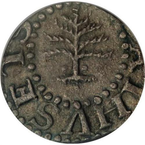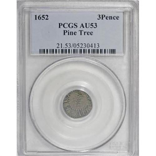 <B>1652 3PENCE Pine Tree Threepence AU53 PCGS.</B></I> Pellets at trunk. Crosby 1-A1, Noe-34, R.4. A full, bold tree and unabraded dove-gray surfaces confirm the eye appeal. The obverse is uncentered toward 12:30, as usual for Noe-34, and the reverse is moderately misaligned toward 7:30. Mildly wavy, as made, and the EN in ENGLAND is soft. Small mint-made clips are present at 1 and 5 o'clock. There are only four Noe varieties of Pine Tree threepence, and all are very scarce to rare. Listed on page 37 of the 2007 <I>Guide Book</B></I>. Population: 4 in 53, 16 finer (11/07).<BR><BR><b>Shipping:</b> Coins & Currency (<a target="_blank" href="http://www.heritageauctions.com/common/shipping.php">view shipping information</a>)
