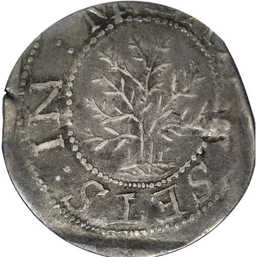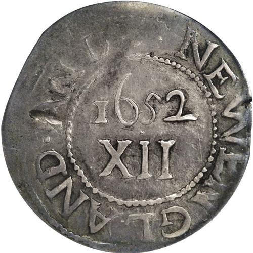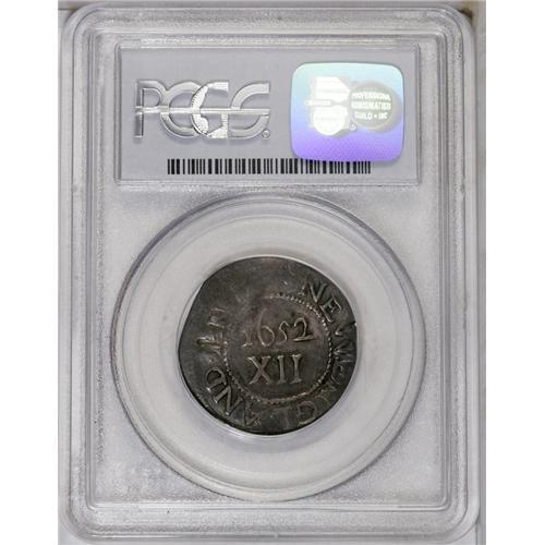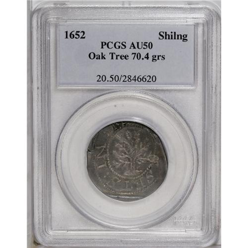<B>1652 SHILNG Oak Tree Shilling AU50 PCGS.</B></I> Noe-3, Crosby 9-G, R.6. 70.4 grains. Light aqua-blue, rose-pink, and tan toning enriches this satiny and wavy Oak Tree shilling. The tree is exquisitely detailed, as is the date and denomination. The horizontal recession on the obverse exergue is in fact an impression from the lower edge of the obverse die, as explained in Hain:18. The vertical left edge of the obverse die is also partly present. The obverse is misaligned toward 1 o'clock, as always seen, and the reverse is misaligned toward 5 o'clock, as usually encountered. Indistinct detail on the upper reverse is because the die was weakly engraved in that area. A straight clip at 3 o'clock is mint-made, to bring the piece within weight standards. A small edge flaw at 9 o'clock is also as made. The only detraction is a thin dig on the left upright of the A in AN DO, which causes a raised, flat area opposite near 3 o'clock. Listed on page 37 of the 2007 <I>Guide Book.</B></I><BR><I>From The Jones Beach Collection.</B></I><BR><BR><b>Shipping:</b> Coin/Currency (<a target="_blank" href="http://www.heritageauctions.com/common/shipping.php">view shipping information</a>)