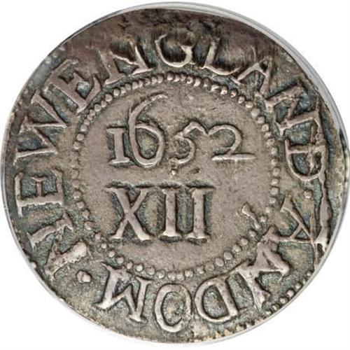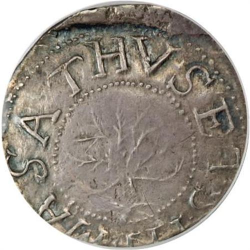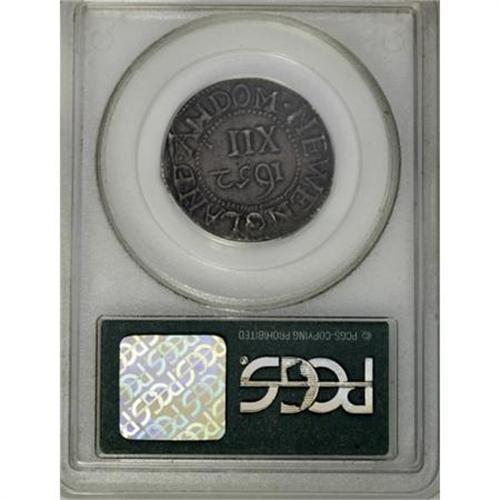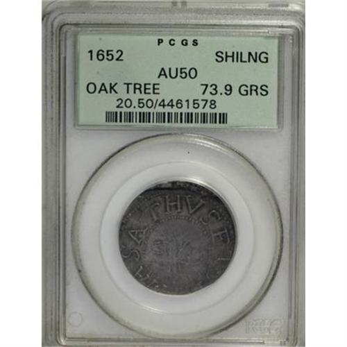 <B>1652 SHILNG Oak Tree Shilling AU50 PCGS.</B></I> IN at left. Noe-5, Crosby 2-D, R.2. 73.9 grains. The reverse die cracks at 3 o'clock are advanced, an intermediate die state. Housed in an older green-label PCGS holder.<BR> The Noe-5 ranks among the common varieties of Oak Tree shillings. The surfaces are pleasing with delightful lilac and iridescent toning on both sides. A noticeable planchet bend at 12 o'clock is located outside the beaded border. The obverse is imperfectly centered and the reverse is nicely centered with full letting. The particular centering of this piece is typical of the variety.<BR><BR><b>Shipping:</b> Coins & Currency (<a target="_blank" href="http://www.heritageauctions.com/common/shipping.php">view shipping information</a>)