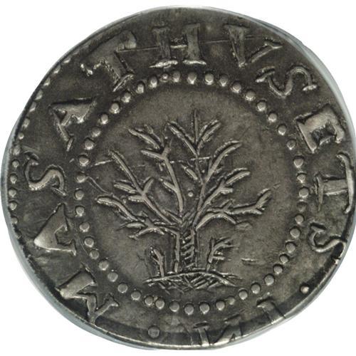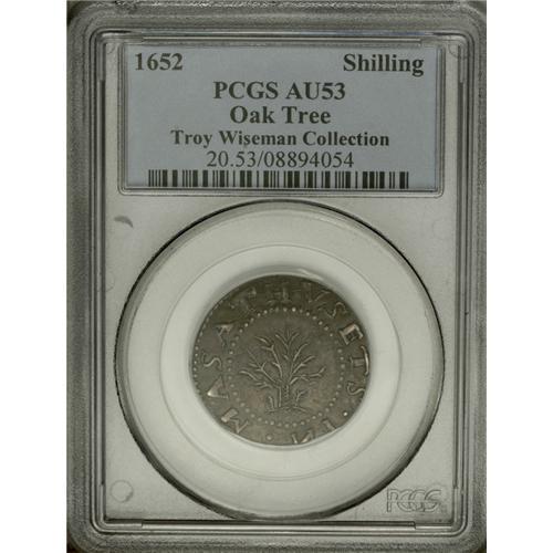 <B>1652 SHILNG Oak Tree Shilling AU53 PCGS.</B></I> Noe-11, Crosby 6b-E2, R.6. A remarkable example of Noe-11, superior to any of three Boyd/Ford specimens in both sharpness and overall quality. In its appearance in the Hain Family auction, the present piece was described as "One of the Finest Seen", and "far finer than Norweb:1168, Oechsner:933, NN 60th:196." The top of the 1 in the date is soft, perhaps due to a mint strike-through, but the remainder of this battleship-gray example is satiny and smooth. Minor straight mint-made clips affect only the top of IN, with the rest of the legends intact. Thin horizontal lines across the upper portion of the tree are from the die, and are characteristic of Noe-11. Listed on page 37 of the 2007 <I>Guide Book.</B></I><BR><I>Ex: Spink & Son (London); Vlack Collection; Hain Family Collection (Stack's, 1/02), lot 37.</B></I><BR><I>From The Troy Wiseman Collection, Part Two.</B></I><BR><BR><b>Shipping:</b> Coin/Currency (<a target="_blank" href="http://www.heritageauctions.com/common/shipping.php">view shipping information</a>)