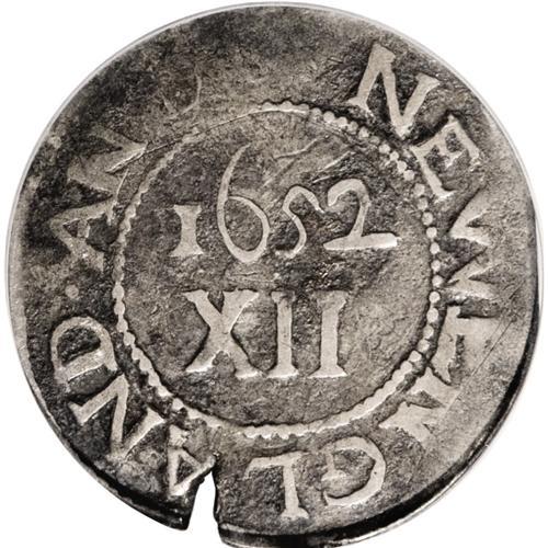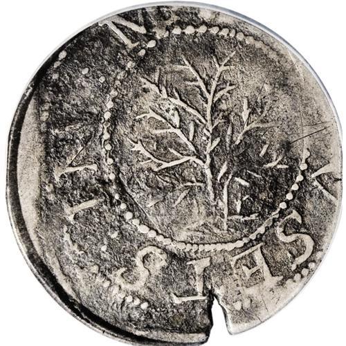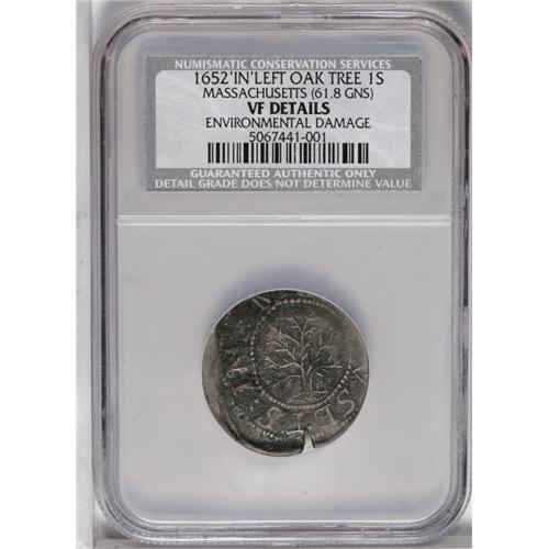 <B>1652<img border='0' src='http://www.heritagecoins.com/images/star.gif' width=10 height=10>HILNG> Oak Tree Shilling--Environmental Damage--NCS. VF Details.</B></I> Noe-3, Crosby 9-G, R.6. 61.8 grains. The two Hain Family specimens weighed 72.2 grains and 69.1 grains. The slate-gray and dark russet surfaces are moderately granular. Evenly struck, although DO is weak as it was faintly engraved into the die. The obverse is uncentered toward 1:30, with ASATH mostly off the flan. The reverse is well centered. A pie-shaped flan crack is present, as made, at 6 o'clock. Listed on page 36 of the 2007 <I>Guide Book.</B></I>