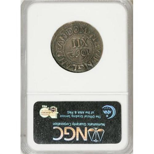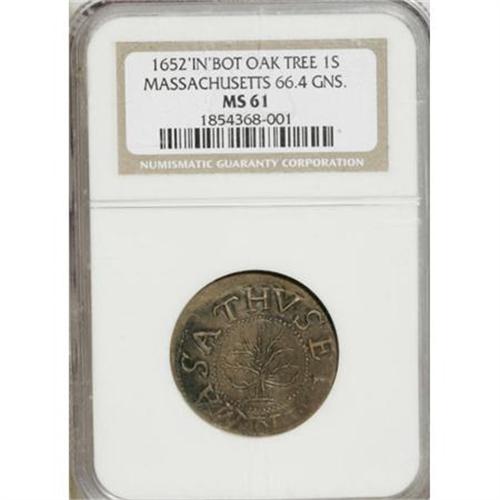 <B>1652 SHILNG Oak Tree Shilling MS61 NGC.</B></I> IN at left. Noe-5, Crosby 2-D, R.2. 66.4 grains. An intermediate die state with vertical breaks present at 3 o'clock on the reverse, but these are less advanced than sometimes seen. Noe-4 through Noe-7 share the same reverse die, but the obverses differ, particularly on the shape of the tree and the spacing of ATH. A remarkable dove-gray Oak Tree shilling whose unworn surfaces display fine raised lines present on the dies. Slightly wavy, as made and as always. The strike is crisp throughout save for minor softness on the obverse near 5 o'clock. Listed on page 37 of the 2008 <I>Guide Book.</B></I><BR><BR><b>Shipping:</b> Coins & Currency (<a target="_blank" href="http://www.heritageauctions.com/common/shipping.php">view shipping information</a>)