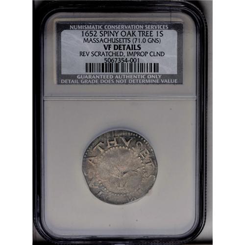 <B>1652<img border='0' src='http://www.heritagecoins.com/images/star.gif' width=10 height=10>HILNG> Oak Tree Shilling--Reverse Scratched, Improperly Cleaned--NCS. VF Details.</B></I> Noe-13.3 or possibly Noe-13.6. This piece appears to have attributes of both die states, and is approaching the later Spiny Tree die state of Noe-14. Pleasing light gray surfaces with evidence of light cleaning. The reverse has a few minor scratches, but they are not serious. Listed on page 37 of the 2006 <I>Guide Book.</B></I><BR><I>From The Steve Glenn Collection, Part Two.</B></I>