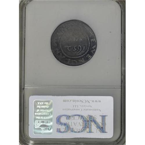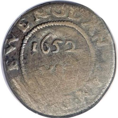<B>1652 SHILNG Oak Tree Shilling--Scratched, Planchet Flaw--NCS. VG Details.</B></I> IN at bottom. Noe-9, Crosby 4-C, R.5. 64.4 grains. Struck on a rocker press, as were the Willow Tree pieces that preceded the Oak Tree coinage. This accounts for the bands of weak details seen on each side. But as can be seen from the details grade this piece also saw heavy usage in the channels of commerce in 17th century America. A long, deep planchet flaw is located between 7 and 9 o'clock on the obverse, and shallow, crisscrossing scratches are on both obverse and reverse. Light to medium gray toning. Listed on page 37 of the 2008 <I>Guide Book</B></I>.<BR><BR><b>Shipping:</b> Coins & Currency (<a target="_blank" href="http://www.heritageauctions.com/common/shipping.php">view shipping information</a>)