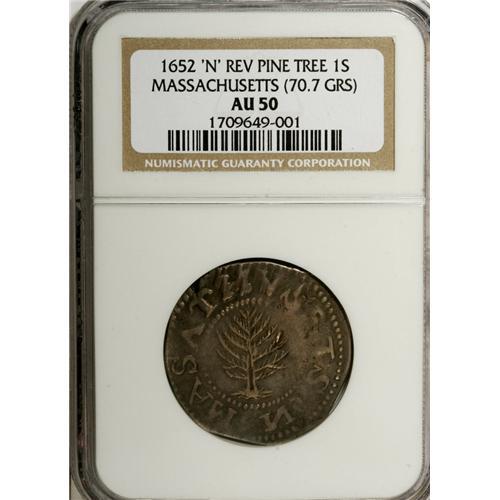 <B>1652 SHILNG Pine Tree Shilling, Large Planchet AU50 NGC.</B></I> Noe-10, Crosby 1a-C, R.3. 70.7 grains. Retrograde first N in ENGLAND, prominent tree roots. An impressive Large Planchet Pine Tree shilling with a full, bold tree and essentially complete legends, although a small edge flaw at 10:30 affects one letter on each side. Moderately wavy, as made, with substantial luster and lovely sea-green and dove-gray toning. Listed on page 37 of the 2007 <I>Guide Book.</B></I><BR><BR><b>Shipping:</b> Coin/Currency (<a target="_blank" href="http://www.heritageauctions.com/common/shipping.php">view shipping information</a>)